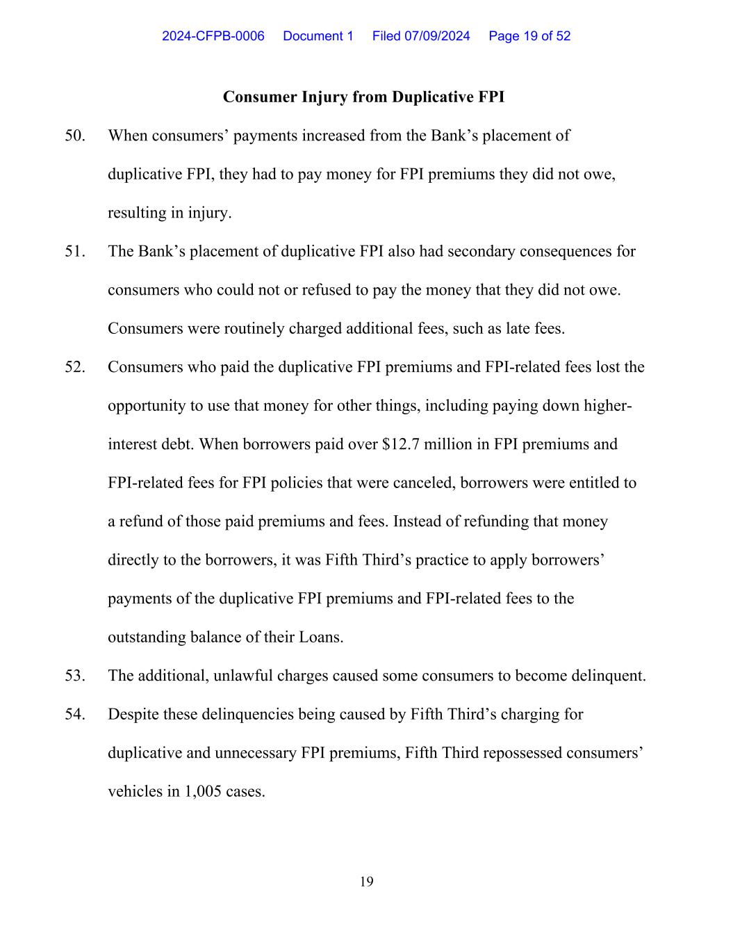 19 Consumer Injury from Duplicative FPI 50. When consumers’ payments increased from the Bank’s placement of duplicative FPI, they had to pay money for FPI premiums they did not owe, resulting in injury. 51. The Bank’s placement of duplicative FPI also had secondary consequences for consumers who could not or refused to pay the money that they did not owe. Consumers were routinely charged additional fees, such as late fees. 52. Consumers who paid the duplicative FPI premiums and FPI-related fees lost the opportunity to use that money for other things, including paying down higher- interest debt. When borrowers paid over $12.7 million in FPI premiums and FPI-related fees for FPI policies that were canceled, borrowers were entitled to a refund of those paid premiums and fees. Instead of refunding that money directly to the borrowers, it was Fifth Third’s practice to apply borrowers’ payments of the duplicative FPI premiums and FPI-related fees to the outstanding balance of their Loans. 53. The additional, unlawful charges caused some consumers to become delinquent. 54. Despite these delinquencies being caused by Fifth Third’s charging for duplicative and unnecessary FPI premiums, Fifth Third repossessed consumers’ vehicles in 1,005 cases. 2024-CFPB-0006 Document 1 Filed 07/09/2024 Page 19 of 52