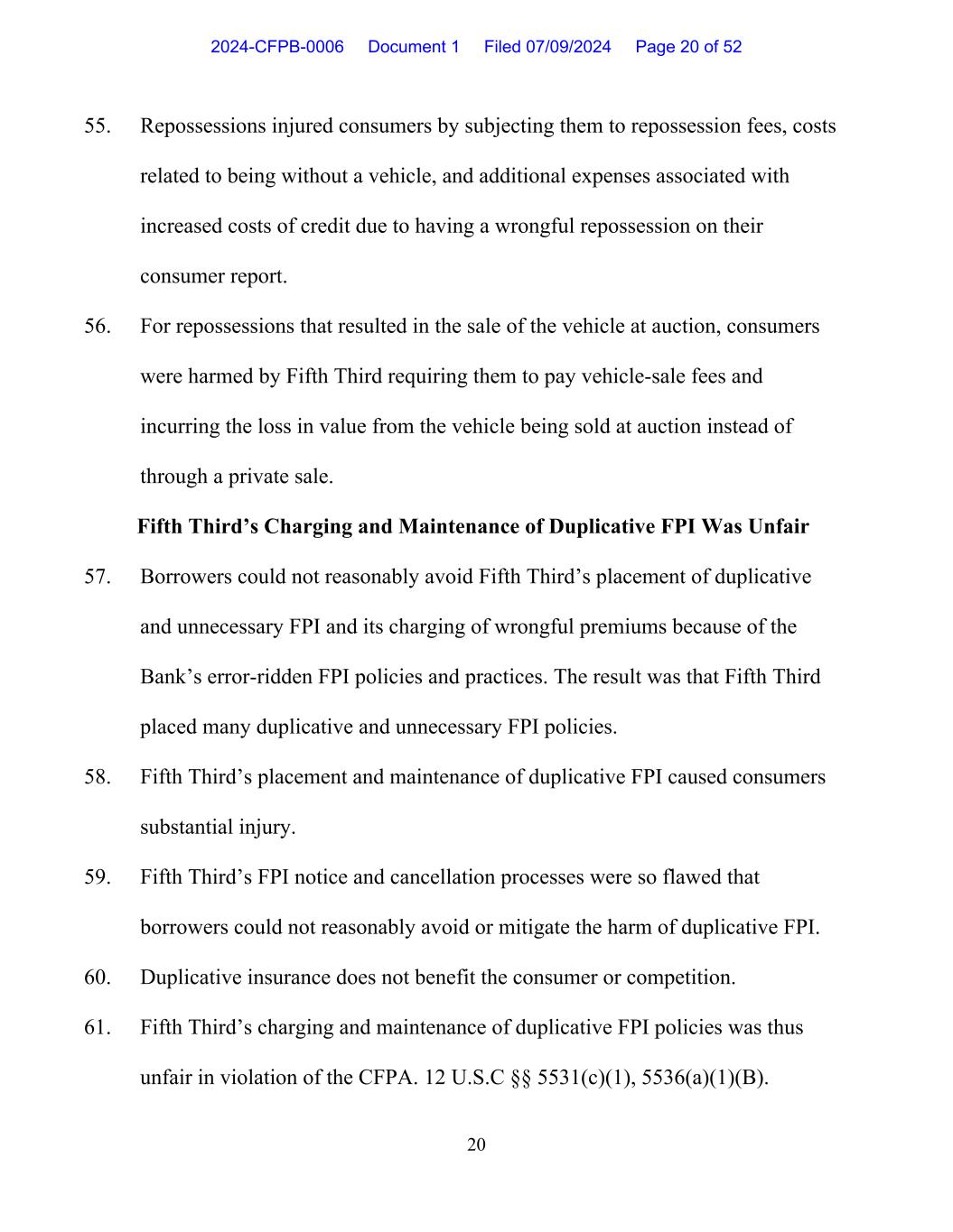 20 55. Repossessions injured consumers by subjecting them to repossession fees, costs related to being without a vehicle, and additional expenses associated with increased costs of credit due to having a wrongful repossession on their consumer report. 56. For repossessions that resulted in the sale of the vehicle at auction, consumers were harmed by Fifth Third requiring them to pay vehicle-sale fees and incurring the loss in value from the vehicle being sold at auction instead of through a private sale. Fifth Third’s Charging and Maintenance of Duplicative FPI Was Unfair 57. Borrowers could not reasonably avoid Fifth Third’s placement of duplicative and unnecessary FPI and its charging of wrongful premiums because of the Bank’s error-ridden FPI policies and practices. The result was that Fifth Third placed many duplicative and unnecessary FPI policies. 58. Fifth Third’s placement and maintenance of duplicative FPI caused consumers substantial injury. 59. Fifth Third’s FPI notice and cancellation processes were so flawed that borrowers could not reasonably avoid or mitigate the harm of duplicative FPI. 60. Duplicative insurance does not benefit the consumer or competition. 61. Fifth Third’s charging and maintenance of duplicative FPI policies was thus unfair in violation of the CFPA. 12 U.S.C §§ 5531(c)(1), 5536(a)(1)(B). 2024-CFPB-0006 Document 1 Filed 07/09/2024 Page 20 of 52