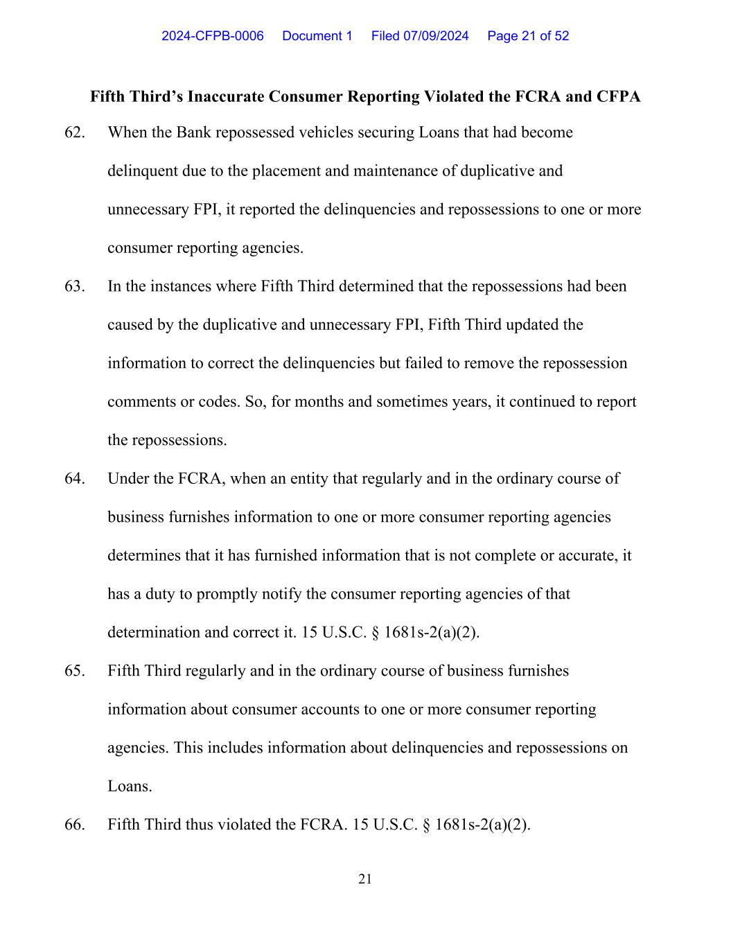 21 Fifth Third’s Inaccurate Consumer Reporting Violated the FCRA and CFPA 62. When the Bank repossessed vehicles securing Loans that had become delinquent due to the placement and maintenance of duplicative and unnecessary FPI, it reported the delinquencies and repossessions to one or more consumer reporting agencies. 63. In the instances where Fifth Third determined that the repossessions had been caused by the duplicative and unnecessary FPI, Fifth Third updated the information to correct the delinquencies but failed to remove the repossession comments or codes. So, for months and sometimes years, it continued to report the repossessions. 64. Under the FCRA, when an entity that regularly and in the ordinary course of business furnishes information to one or more consumer reporting agencies determines that it has furnished information that is not complete or accurate, it has a duty to promptly notify the consumer reporting agencies of that determination and correct it. 15 U.S.C. § 1681s-2(a)(2). 65. Fifth Third regularly and in the ordinary course of business furnishes information about consumer accounts to one or more consumer reporting agencies. This includes information about delinquencies and repossessions on Loans. 66. Fifth Third thus violated the FCRA. 15 U.S.C. § 1681s-2(a)(2). 2024-CFPB-0006 Document 1 Filed 07/09/2024 Page 21 of 52
