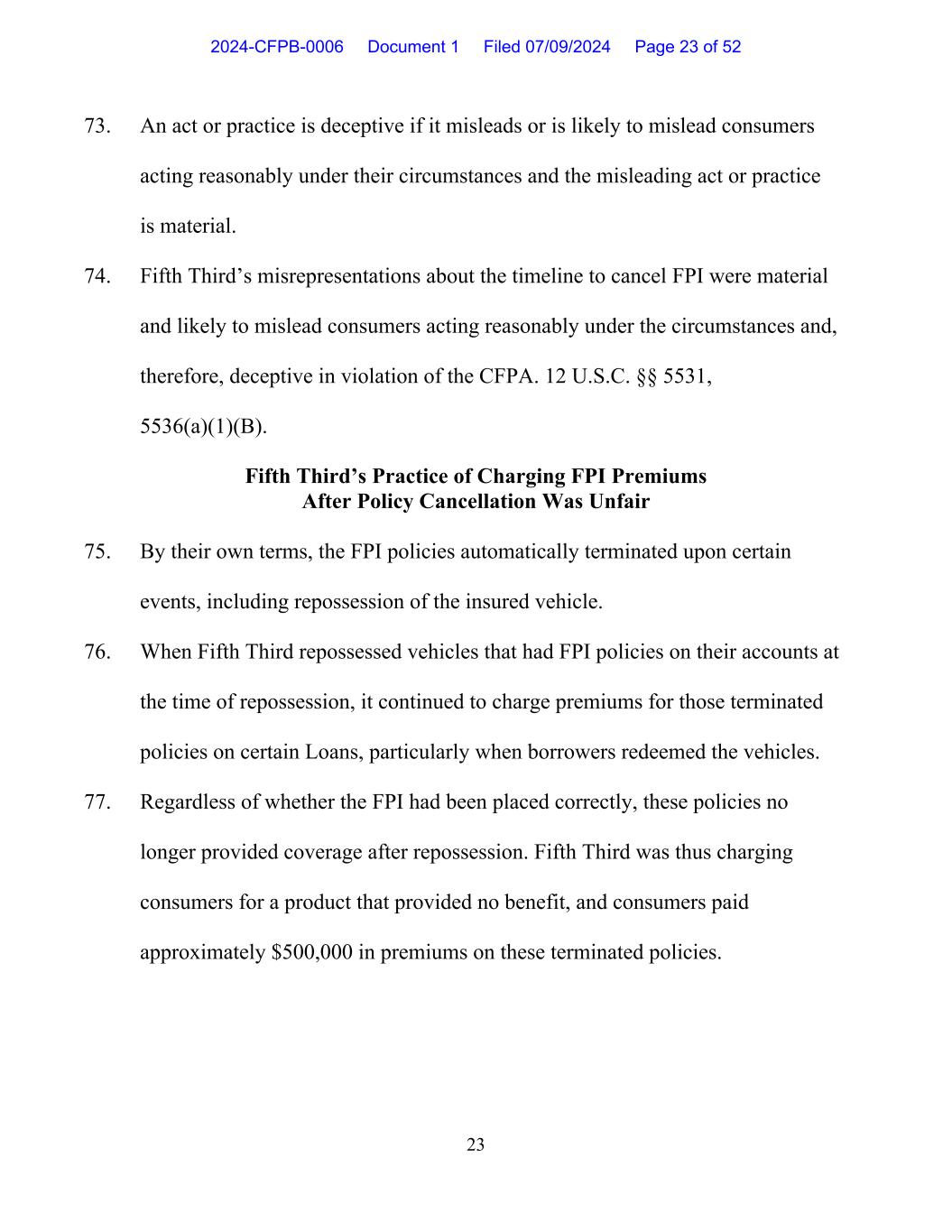 23 73. An act or practice is deceptive if it misleads or is likely to mislead consumers acting reasonably under their circumstances and the misleading act or practice is material. 74. Fifth Third’s misrepresentations about the timeline to cancel FPI were material and likely to mislead consumers acting reasonably under the circumstances and, therefore, deceptive in violation of the CFPA. 12 U.S.C. §§ 5531, 5536(a)(1)(B). Fifth Third’s Practice of Charging FPI Premiums After Policy Cancellation Was Unfair 75. By their own terms, the FPI policies automatically terminated upon certain events, including repossession of the insured vehicle. 76. When Fifth Third repossessed vehicles that had FPI policies on their accounts at the time of repossession, it continued to charge premiums for those terminated policies on certain Loans, particularly when borrowers redeemed the vehicles. 77. Regardless of whether the FPI had been placed correctly, these policies no longer provided coverage after repossession. Fifth Third was thus charging consumers for a product that provided no benefit, and consumers paid approximately $500,000 in premiums on these terminated policies. 2024-CFPB-0006 Document 1 Filed 07/09/2024 Page 23 of 52