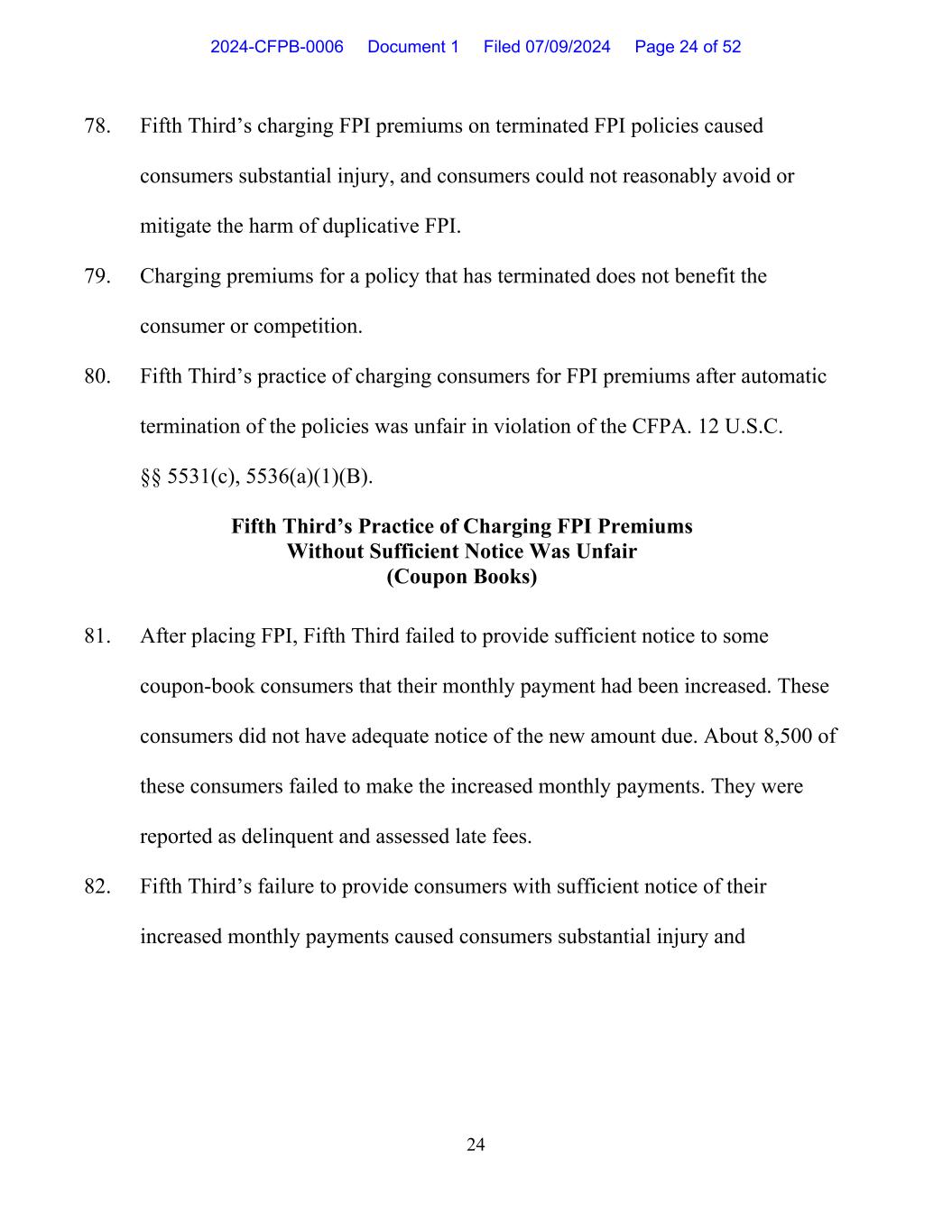 24 78. Fifth Third’s charging FPI premiums on terminated FPI policies caused consumers substantial injury, and consumers could not reasonably avoid or mitigate the harm of duplicative FPI. 79. Charging premiums for a policy that has terminated does not benefit the consumer or competition. 80. Fifth Third’s practice of charging consumers for FPI premiums after automatic termination of the policies was unfair in violation of the CFPA. 12 U.S.C. §§ 5531(c), 5536(a)(1)(B). Fifth Third’s Practice of Charging FPI Premiums Without Sufficient Notice Was Unfair (Coupon Books) 81. After placing FPI, Fifth Third failed to provide sufficient notice to some coupon-book consumers that their monthly payment had been increased. These consumers did not have adequate notice of the new amount due. About 8,500 of these consumers failed to make the increased monthly payments. They were reported as delinquent and assessed late fees. 82. Fifth Third’s failure to provide consumers with sufficient notice of their increased monthly payments caused consumers substantial injury and 2024-CFPB-0006 Document 1 Filed 07/09/2024 Page 24 of 52