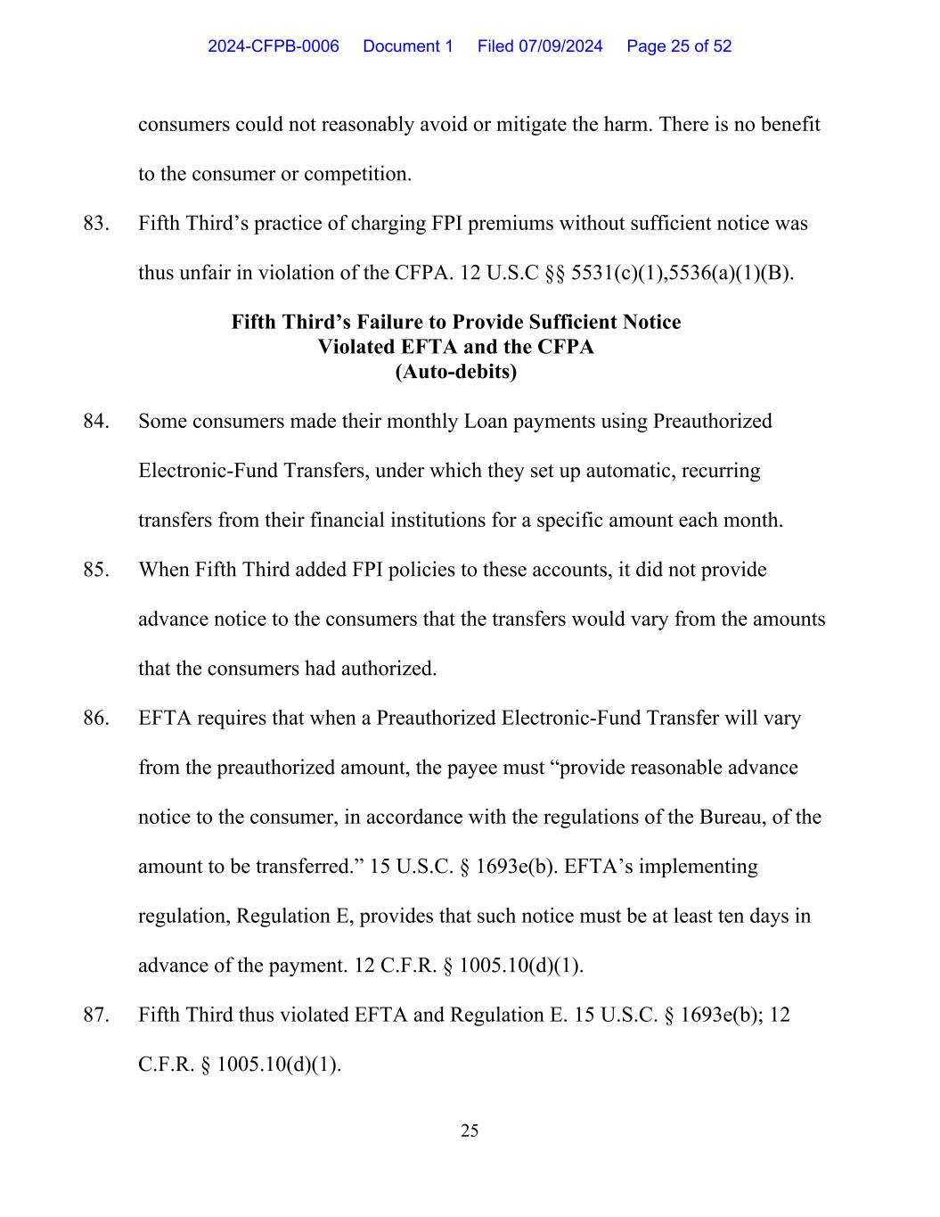 25 consumers could not reasonably avoid or mitigate the harm. There is no benefit to the consumer or competition. 83. Fifth Third’s practice of charging FPI premiums without sufficient notice was thus unfair in violation of the CFPA. 12 U.S.C §§ 5531(c)(1),5536(a)(1)(B). Fifth Third’s Failure to Provide Sufficient Notice Violated EFTA and the CFPA (Auto-debits) 84. Some consumers made their monthly Loan payments using Preauthorized Electronic-Fund Transfers, under which they set up automatic, recurring transfers from their financial institutions for a specific amount each month. 85. When Fifth Third added FPI policies to these accounts, it did not provide advance notice to the consumers that the transfers would vary from the amounts that the consumers had authorized. 86. EFTA requires that when a Preauthorized Electronic-Fund Transfer will vary from the preauthorized amount, the payee must “provide reasonable advance notice to the consumer, in accordance with the regulations of the Bureau, of the amount to be transferred.” 15 U.S.C. § 1693e(b). EFTA’s implementing regulation, Regulation E, provides that such notice must be at least ten days in advance of the payment. 12 C.F.R. § 1005.10(d)(1). 87. Fifth Third thus violated EFTA and Regulation E. 15 U.S.C. § 1693e(b); 12 C.F.R. § 1005.10(d)(1). 2024-CFPB-0006 Document 1 Filed 07/09/2024 Page 25 of 52