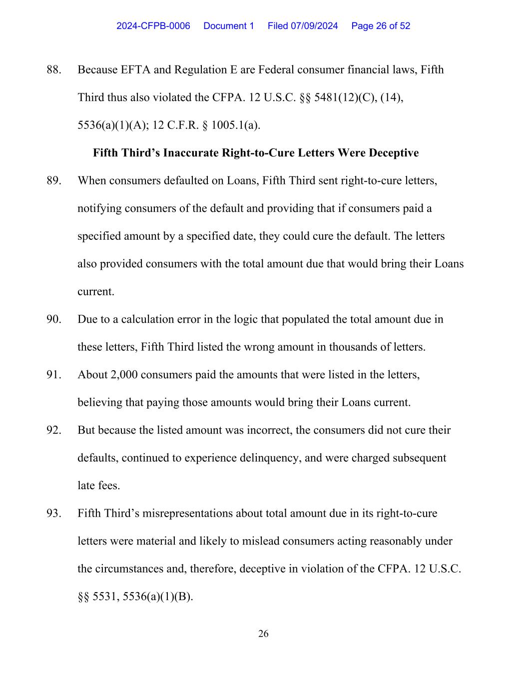 26 88. Because EFTA and Regulation E are Federal consumer financial laws, Fifth Third thus also violated the CFPA. 12 U.S.C. §§ 5481(12)(C), (14), 5536(a)(1)(A); 12 C.F.R. § 1005.1(a). Fifth Third’s Inaccurate Right-to-Cure Letters Were Deceptive 89. When consumers defaulted on Loans, Fifth Third sent right-to-cure letters, notifying consumers of the default and providing that if consumers paid a specified amount by a specified date, they could cure the default. The letters also provided consumers with the total amount due that would bring their Loans current. 90. Due to a calculation error in the logic that populated the total amount due in these letters, Fifth Third listed the wrong amount in thousands of letters. 91. About 2,000 consumers paid the amounts that were listed in the letters, believing that paying those amounts would bring their Loans current. 92. But because the listed amount was incorrect, the consumers did not cure their defaults, continued to experience delinquency, and were charged subsequent late fees. 93. Fifth Third’s misrepresentations about total amount due in its right-to-cure letters were material and likely to mislead consumers acting reasonably under the circumstances and, therefore, deceptive in violation of the CFPA. 12 U.S.C. §§ 5531, 5536(a)(1)(B). 2024-CFPB-0006 Document 1 Filed 07/09/2024 Page 26 of 52