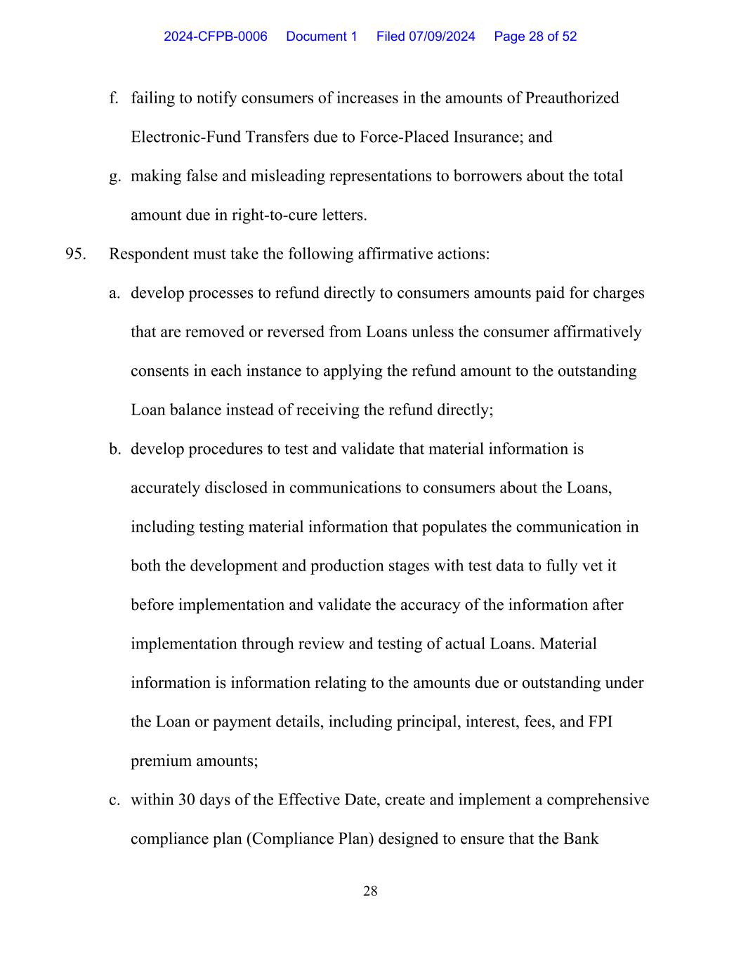 28 f. failing to notify consumers of increases in the amounts of Preauthorized Electronic-Fund Transfers due to Force-Placed Insurance; and g. making false and misleading representations to borrowers about the total amount due in right-to-cure letters. 95. Respondent must take the following affirmative actions: a. develop processes to refund directly to consumers amounts paid for charges that are removed or reversed from Loans unless the consumer affirmatively consents in each instance to applying the refund amount to the outstanding Loan balance instead of receiving the refund directly; b. develop procedures to test and validate that material information is accurately disclosed in communications to consumers about the Loans, including testing material information that populates the communication in both the development and production stages with test data to fully vet it before implementation and validate the accuracy of the information after implementation through review and testing of actual Loans. Material information is information relating to the amounts due or outstanding under the Loan or payment details, including principal, interest, fees, and FPI premium amounts; c. within 30 days of the Effective Date, create and implement a comprehensive compliance plan (Compliance Plan) designed to ensure that the Bank 2024-CFPB-0006 Document 1 Filed 07/09/2024 Page 28 of 52