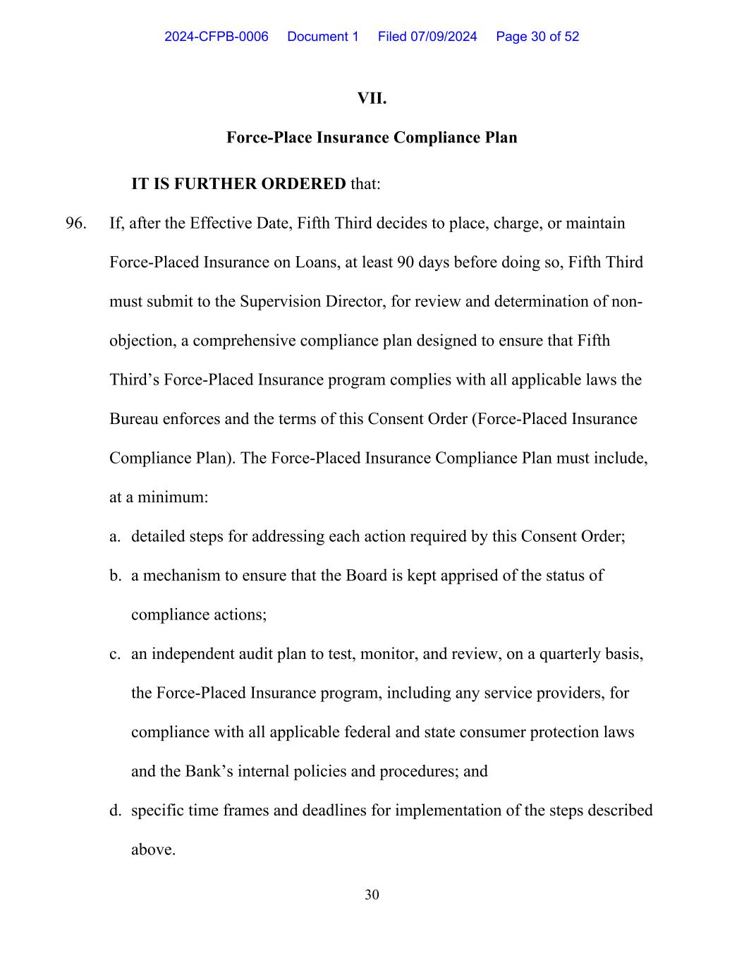 30 VII. Force-Place Insurance Compliance Plan IT IS FURTHER ORDERED that: 96. If, after the Effective Date, Fifth Third decides to place, charge, or maintain Force-Placed Insurance on Loans, at least 90 days before doing so, Fifth Third must submit to the Supervision Director, for review and determination of non- objection, a comprehensive compliance plan designed to ensure that Fifth Third’s Force-Placed Insurance program complies with all applicable laws the Bureau enforces and the terms of this Consent Order (Force-Placed Insurance Compliance Plan). The Force-Placed Insurance Compliance Plan must include, at a minimum: a. detailed steps for addressing each action required by this Consent Order; b. a mechanism to ensure that the Board is kept apprised of the status of compliance actions; c. an independent audit plan to test, monitor, and review, on a quarterly basis, the Force-Placed Insurance program, including any service providers, for compliance with all applicable federal and state consumer protection laws and the Bank’s internal policies and procedures; and d. specific time frames and deadlines for implementation of the steps described above. 2024-CFPB-0006 Document 1 Filed 07/09/2024 Page 30 of 52