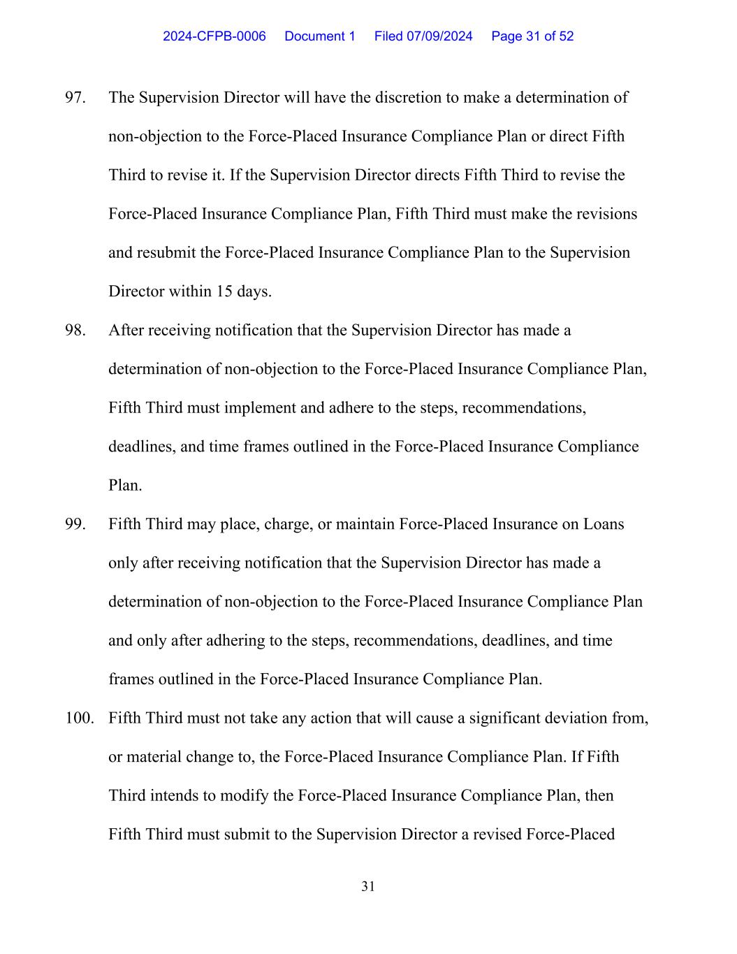 31 97. The Supervision Director will have the discretion to make a determination of non-objection to the Force-Placed Insurance Compliance Plan or direct Fifth Third to revise it. If the Supervision Director directs Fifth Third to revise the Force-Placed Insurance Compliance Plan, Fifth Third must make the revisions and resubmit the Force-Placed Insurance Compliance Plan to the Supervision Director within 15 days. 98. After receiving notification that the Supervision Director has made a determination of non-objection to the Force-Placed Insurance Compliance Plan, Fifth Third must implement and adhere to the steps, recommendations, deadlines, and time frames outlined in the Force-Placed Insurance Compliance Plan. 99. Fifth Third may place, charge, or maintain Force-Placed Insurance on Loans only after receiving notification that the Supervision Director has made a determination of non-objection to the Force-Placed Insurance Compliance Plan and only after adhering to the steps, recommendations, deadlines, and time frames outlined in the Force-Placed Insurance Compliance Plan. 100. Fifth Third must not take any action that will cause a significant deviation from, or material change to, the Force-Placed Insurance Compliance Plan. If Fifth Third intends to modify the Force-Placed Insurance Compliance Plan, then Fifth Third must submit to the Supervision Director a revised Force-Placed 2024-CFPB-0006 Document 1 Filed 07/09/2024 Page 31 of 52