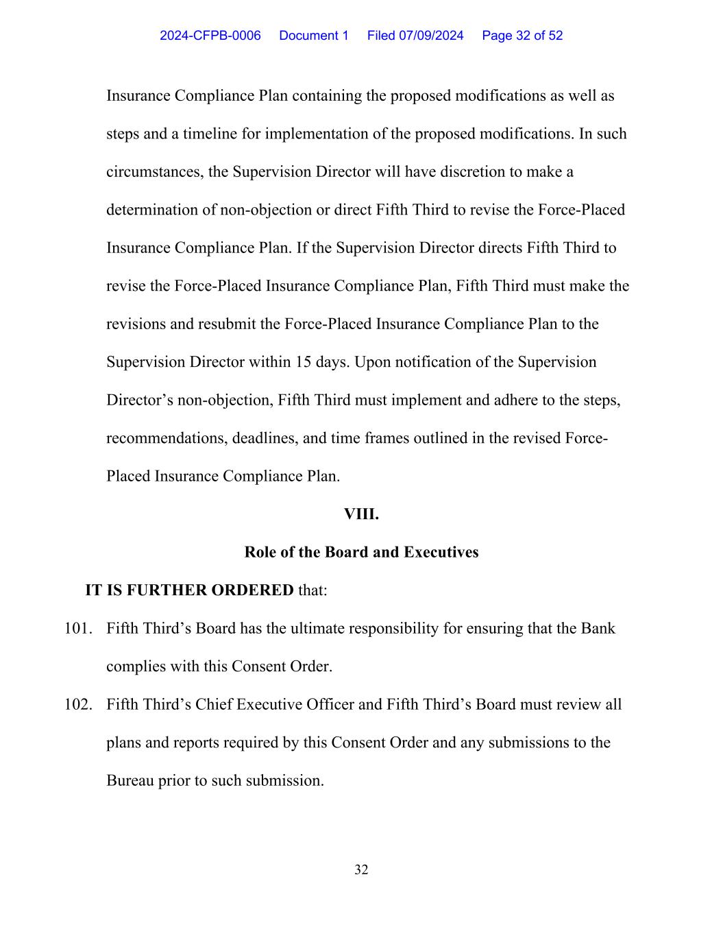 32 Insurance Compliance Plan containing the proposed modifications as well as steps and a timeline for implementation of the proposed modifications. In such circumstances, the Supervision Director will have discretion to make a determination of non-objection or direct Fifth Third to revise the Force-Placed Insurance Compliance Plan. If the Supervision Director directs Fifth Third to revise the Force-Placed Insurance Compliance Plan, Fifth Third must make the revisions and resubmit the Force-Placed Insurance Compliance Plan to the Supervision Director within 15 days. Upon notification of the Supervision Director’s non-objection, Fifth Third must implement and adhere to the steps, recommendations, deadlines, and time frames outlined in the revised Force- Placed Insurance Compliance Plan. VIII. Role of the Board and Executives IT IS FURTHER ORDERED that: 101. Fifth Third’s Board has the ultimate responsibility for ensuring that the Bank complies with this Consent Order. 102. Fifth Third’s Chief Executive Officer and Fifth Third’s Board must review all plans and reports required by this Consent Order and any submissions to the Bureau prior to such submission. 2024-CFPB-0006 Document 1 Filed 07/09/2024 Page 32 of 52