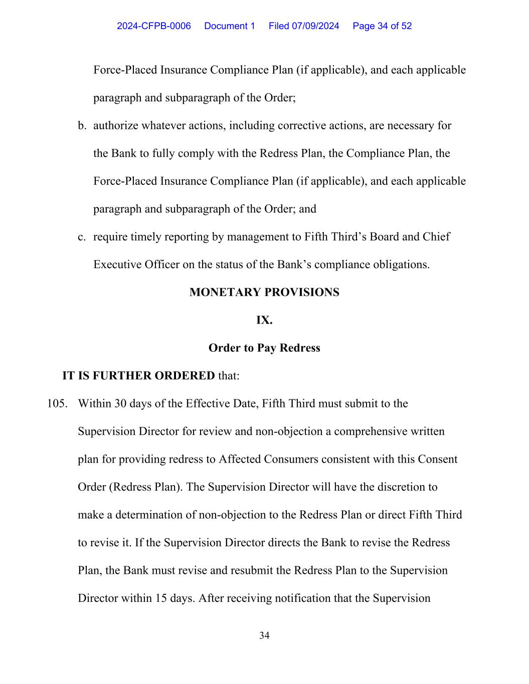 34 Force-Placed Insurance Compliance Plan (if applicable), and each applicable paragraph and subparagraph of the Order; b. authorize whatever actions, including corrective actions, are necessary for the Bank to fully comply with the Redress Plan, the Compliance Plan, the Force-Placed Insurance Compliance Plan (if applicable), and each applicable paragraph and subparagraph of the Order; and c. require timely reporting by management to Fifth Third’s Board and Chief Executive Officer on the status of the Bank’s compliance obligations. MONETARY PROVISIONS IX. Order to Pay Redress IT IS FURTHER ORDERED that: 105. Within 30 days of the Effective Date, Fifth Third must submit to the Supervision Director for review and non-objection a comprehensive written plan for providing redress to Affected Consumers consistent with this Consent Order (Redress Plan). The Supervision Director will have the discretion to make a determination of non-objection to the Redress Plan or direct Fifth Third to revise it. If the Supervision Director directs the Bank to revise the Redress Plan, the Bank must revise and resubmit the Redress Plan to the Supervision Director within 15 days. After receiving notification that the Supervision 2024-CFPB-0006 Document 1 Filed 07/09/2024 Page 34 of 52