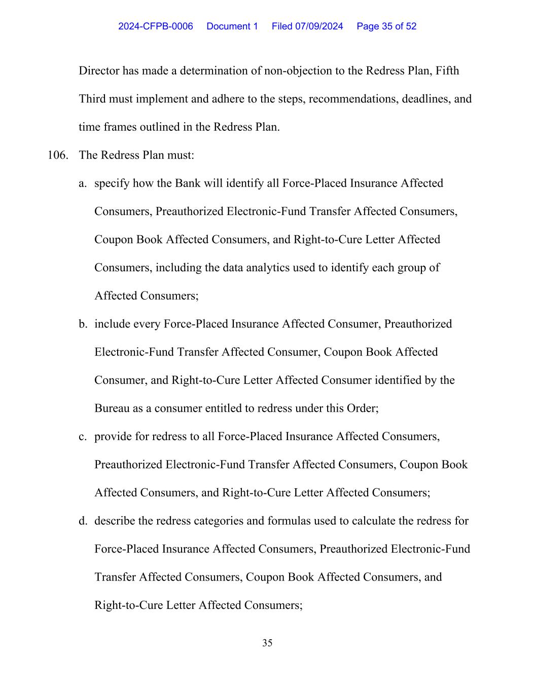 35 Director has made a determination of non-objection to the Redress Plan, Fifth Third must implement and adhere to the steps, recommendations, deadlines, and time frames outlined in the Redress Plan. 106. The Redress Plan must: a. specify how the Bank will identify all Force-Placed Insurance Affected Consumers, Preauthorized Electronic-Fund Transfer Affected Consumers, Coupon Book Affected Consumers, and Right-to-Cure Letter Affected Consumers, including the data analytics used to identify each group of Affected Consumers; b. include every Force-Placed Insurance Affected Consumer, Preauthorized Electronic-Fund Transfer Affected Consumer, Coupon Book Affected Consumer, and Right-to-Cure Letter Affected Consumer identified by the Bureau as a consumer entitled to redress under this Order; c. provide for redress to all Force-Placed Insurance Affected Consumers, Preauthorized Electronic-Fund Transfer Affected Consumers, Coupon Book Affected Consumers, and Right-to-Cure Letter Affected Consumers; d. describe the redress categories and formulas used to calculate the redress for Force-Placed Insurance Affected Consumers, Preauthorized Electronic-Fund Transfer Affected Consumers, Coupon Book Affected Consumers, and Right-to-Cure Letter Affected Consumers; 2024-CFPB-0006 Document 1 Filed 07/09/2024 Page 35 of 52