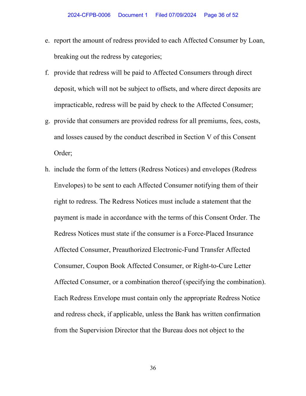 36 e. report the amount of redress provided to each Affected Consumer by Loan, breaking out the redress by categories; f. provide that redress will be paid to Affected Consumers through direct deposit, which will not be subject to offsets, and where direct deposits are impracticable, redress will be paid by check to the Affected Consumer; g. provide that consumers are provided redress for all premiums, fees, costs, and losses caused by the conduct described in Section V of this Consent Order; h. include the form of the letters (Redress Notices) and envelopes (Redress Envelopes) to be sent to each Affected Consumer notifying them of their right to redress. The Redress Notices must include a statement that the payment is made in accordance with the terms of this Consent Order. The Redress Notices must state if the consumer is a Force-Placed Insurance Affected Consumer, Preauthorized Electronic-Fund Transfer Affected Consumer, Coupon Book Affected Consumer, or Right-to-Cure Letter Affected Consumer, or a combination thereof (specifying the combination). Each Redress Envelope must contain only the appropriate Redress Notice and redress check, if applicable, unless the Bank has written confirmation from the Supervision Director that the Bureau does not object to the 2024-CFPB-0006 Document 1 Filed 07/09/2024 Page 36 of 52