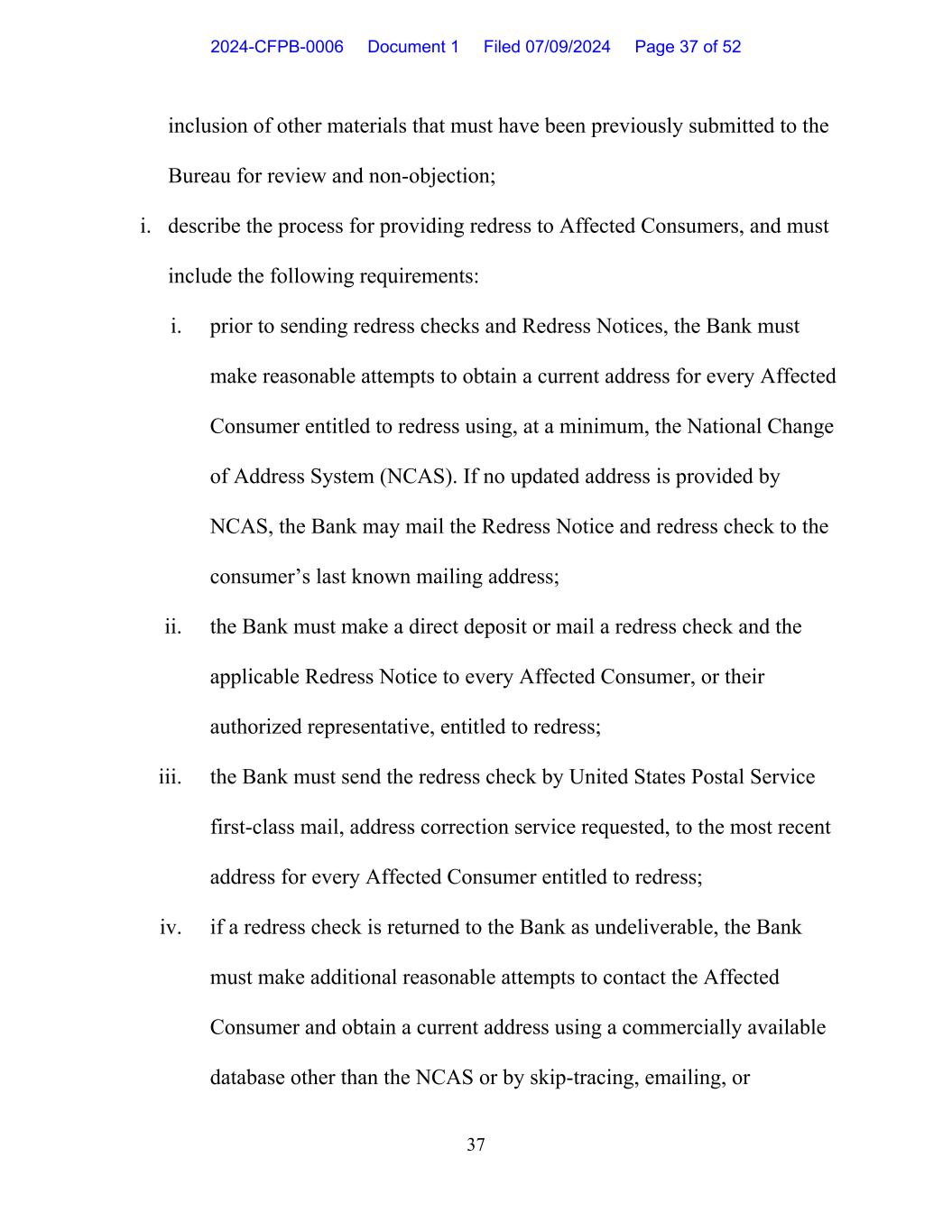 37 inclusion of other materials that must have been previously submitted to the Bureau for review and non-objection; i. describe the process for providing redress to Affected Consumers, and must include the following requirements: i. prior to sending redress checks and Redress Notices, the Bank must make reasonable attempts to obtain a current address for every Affected Consumer entitled to redress using, at a minimum, the National Change of Address System (NCAS). If no updated address is provided by NCAS, the Bank may mail the Redress Notice and redress check to the consumer’s last known mailing address; ii. the Bank must make a direct deposit or mail a redress check and the applicable Redress Notice to every Affected Consumer, or their authorized representative, entitled to redress; iii. the Bank must send the redress check by United States Postal Service first-class mail, address correction service requested, to the most recent address for every Affected Consumer entitled to redress; iv. if a redress check is returned to the Bank as undeliverable, the Bank must make additional reasonable attempts to contact the Affected Consumer and obtain a current address using a commercially available database other than the NCAS or by skip-tracing, emailing, or 2024-CFPB-0006 Document 1 Filed 07/09/2024 Page 37 of 52