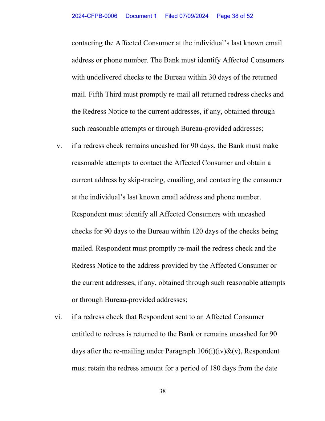 38 contacting the Affected Consumer at the individual’s last known email address or phone number. The Bank must identify Affected Consumers with undelivered checks to the Bureau within 30 days of the returned mail. Fifth Third must promptly re-mail all returned redress checks and the Redress Notice to the current addresses, if any, obtained through such reasonable attempts or through Bureau-provided addresses; v. if a redress check remains uncashed for 90 days, the Bank must make reasonable attempts to contact the Affected Consumer and obtain a current address by skip-tracing, emailing, and contacting the consumer at the individual’s last known email address and phone number. Respondent must identify all Affected Consumers with uncashed checks for 90 days to the Bureau within 120 days of the checks being mailed. Respondent must promptly re-mail the redress check and the Redress Notice to the address provided by the Affected Consumer or the current addresses, if any, obtained through such reasonable attempts or through Bureau-provided addresses; vi. if a redress check that Respondent sent to an Affected Consumer entitled to redress is returned to the Bank or remains uncashed for 90 days after the re-mailing under Paragraph 106(i)(iv)&(v), Respondent must retain the redress amount for a period of 180 days from the date 2024-CFPB-0006 Document 1 Filed 07/09/2024 Page 38 of 52