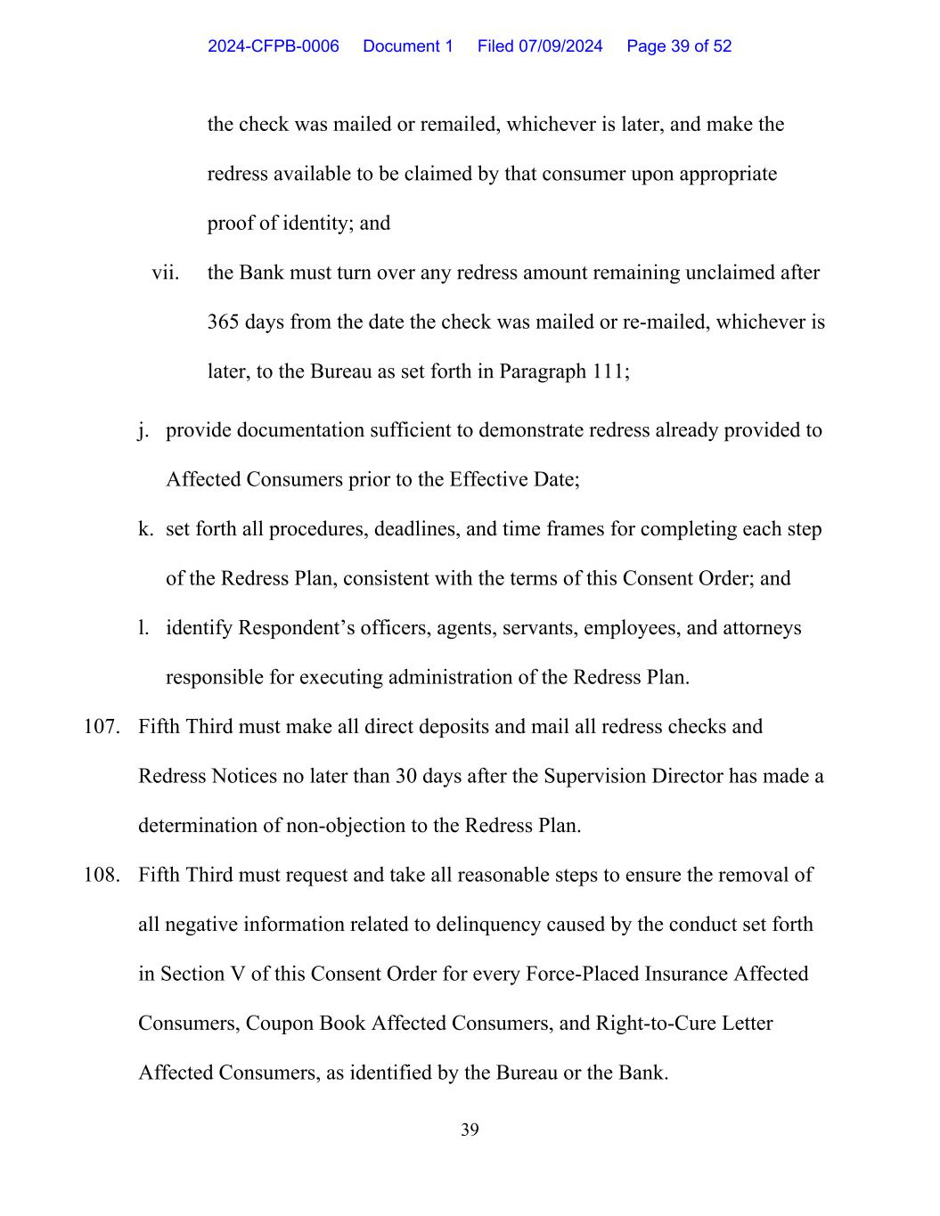 39 the check was mailed or remailed, whichever is later, and make the redress available to be claimed by that consumer upon appropriate proof of identity; and vii. the Bank must turn over any redress amount remaining unclaimed after 365 days from the date the check was mailed or re-mailed, whichever is later, to the Bureau as set forth in Paragraph 111; j. provide documentation sufficient to demonstrate redress already provided to Affected Consumers prior to the Effective Date; k. set forth all procedures, deadlines, and time frames for completing each step of the Redress Plan, consistent with the terms of this Consent Order; and l. identify Respondent’s officers, agents, servants, employees, and attorneys responsible for executing administration of the Redress Plan. 107. Fifth Third must make all direct deposits and mail all redress checks and Redress Notices no later than 30 days after the Supervision Director has made a determination of non-objection to the Redress Plan. 108. Fifth Third must request and take all reasonable steps to ensure the removal of all negative information related to delinquency caused by the conduct set forth in Section V of this Consent Order for every Force-Placed Insurance Affected Consumers, Coupon Book Affected Consumers, and Right-to-Cure Letter Affected Consumers, as identified by the Bureau or the Bank. 2024-CFPB-0006 Document 1 Filed 07/09/2024 Page 39 of 52