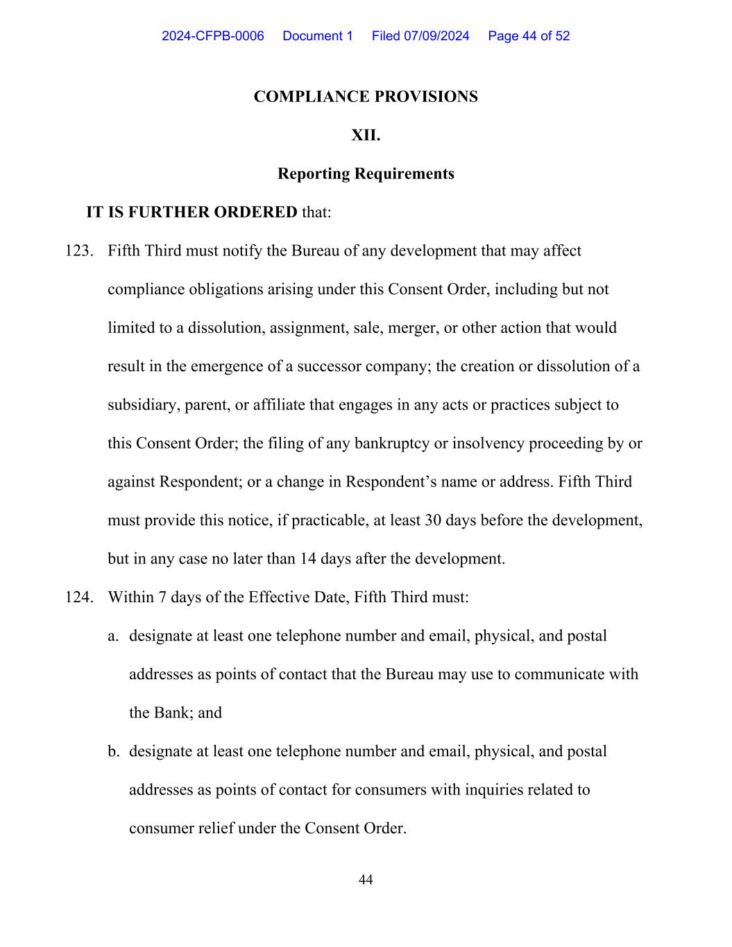 44 COMPLIANCE PROVISIONS XII. Reporting Requirements IT IS FURTHER ORDERED that: 123. Fifth Third must notify the Bureau of any development that may affect compliance obligations arising under this Consent Order, including but not limited to a dissolution, assignment, sale, merger, or other action that would result in the emergence of a successor company; the creation or dissolution of a subsidiary, parent, or affiliate that engages in any acts or practices subject to this Consent Order; the filing of any bankruptcy or insolvency proceeding by or against Respondent; or a change in Respondent’s name or address. Fifth Third must provide this notice, if practicable, at least 30 days before the development, but in any case no later than 14 days after the development. 124. Within 7 days of the Effective Date, Fifth Third must: a. designate at least one telephone number and email, physical, and postal addresses as points of contact that the Bureau may use to communicate with the Bank; and b. designate at least one telephone number and email, physical, and postal addresses as points of contact for consumers with inquiries related to consumer relief under the Consent Order. 2024-CFPB-0006 Document 1 Filed 07/09/2024 Page 44 of 52