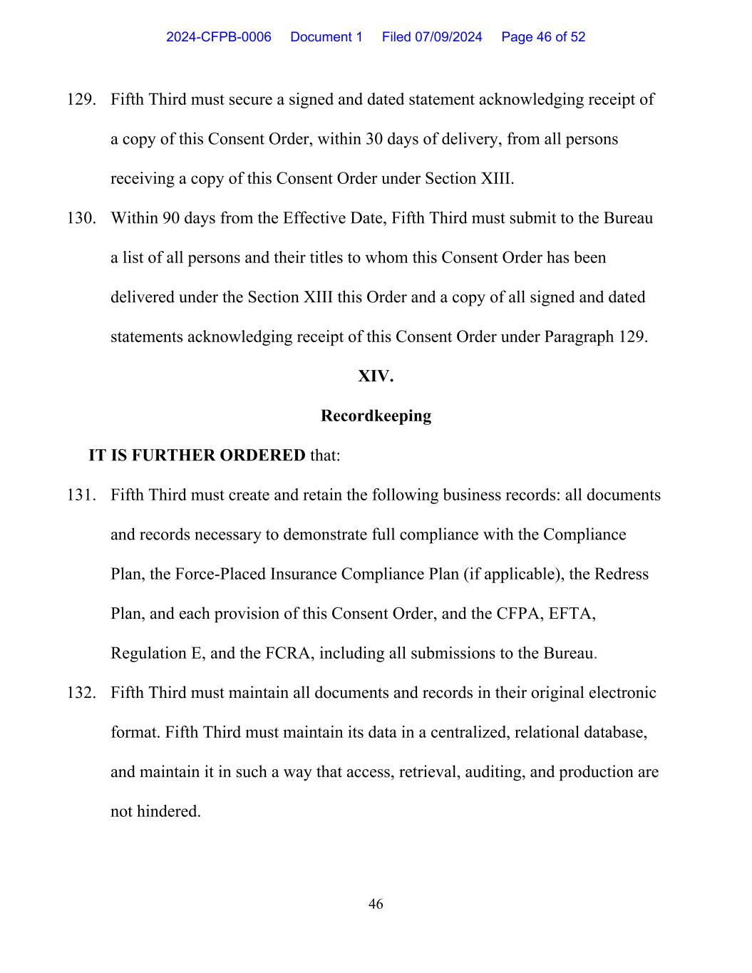 46 129. Fifth Third must secure a signed and dated statement acknowledging receipt of a copy of this Consent Order, within 30 days of delivery, from all persons receiving a copy of this Consent Order under Section XIII. 130. Within 90 days from the Effective Date, Fifth Third must submit to the Bureau a list of all persons and their titles to whom this Consent Order has been delivered under the Section XIII this Order and a copy of all signed and dated statements acknowledging receipt of this Consent Order under Paragraph 129. XIV. Recordkeeping IT IS FURTHER ORDERED that: 131. Fifth Third must create and retain the following business records: all documents and records necessary to demonstrate full compliance with the Compliance Plan, the Force-Placed Insurance Compliance Plan (if applicable), the Redress Plan, and each provision of this Consent Order, and the CFPA, EFTA, Regulation E, and the FCRA, including all submissions to the Bureau. 132. Fifth Third must maintain all documents and records in their original electronic format. Fifth Third must maintain its data in a centralized, relational database, and maintain it in such a way that access, retrieval, auditing, and production are not hindered. 2024-CFPB-0006 Document 1 Filed 07/09/2024 Page 46 of 52
