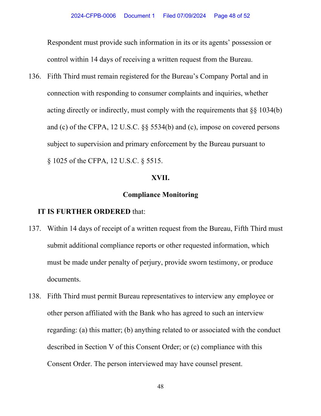 48 Respondent must provide such information in its or its agents’ possession or control within 14 days of receiving a written request from the Bureau. 136. Fifth Third must remain registered for the Bureau’s Company Portal and in connection with responding to consumer complaints and inquiries, whether acting directly or indirectly, must comply with the requirements that §§ 1034(b) and (c) of the CFPA, 12 U.S.C. §§ 5534(b) and (c), impose on covered persons subject to supervision and primary enforcement by the Bureau pursuant to § 1025 of the CFPA, 12 U.S.C. § 5515. XVII. Compliance Monitoring IT IS FURTHER ORDERED that: 137. Within 14 days of receipt of a written request from the Bureau, Fifth Third must submit additional compliance reports or other requested information, which must be made under penalty of perjury, provide sworn testimony, or produce documents. 138. Fifth Third must permit Bureau representatives to interview any employee or other person affiliated with the Bank who has agreed to such an interview regarding: (a) this matter; (b) anything related to or associated with the conduct described in Section V of this Consent Order; or (c) compliance with this Consent Order. The person interviewed may have counsel present. 2024-CFPB-0006 Document 1 Filed 07/09/2024 Page 48 of 52