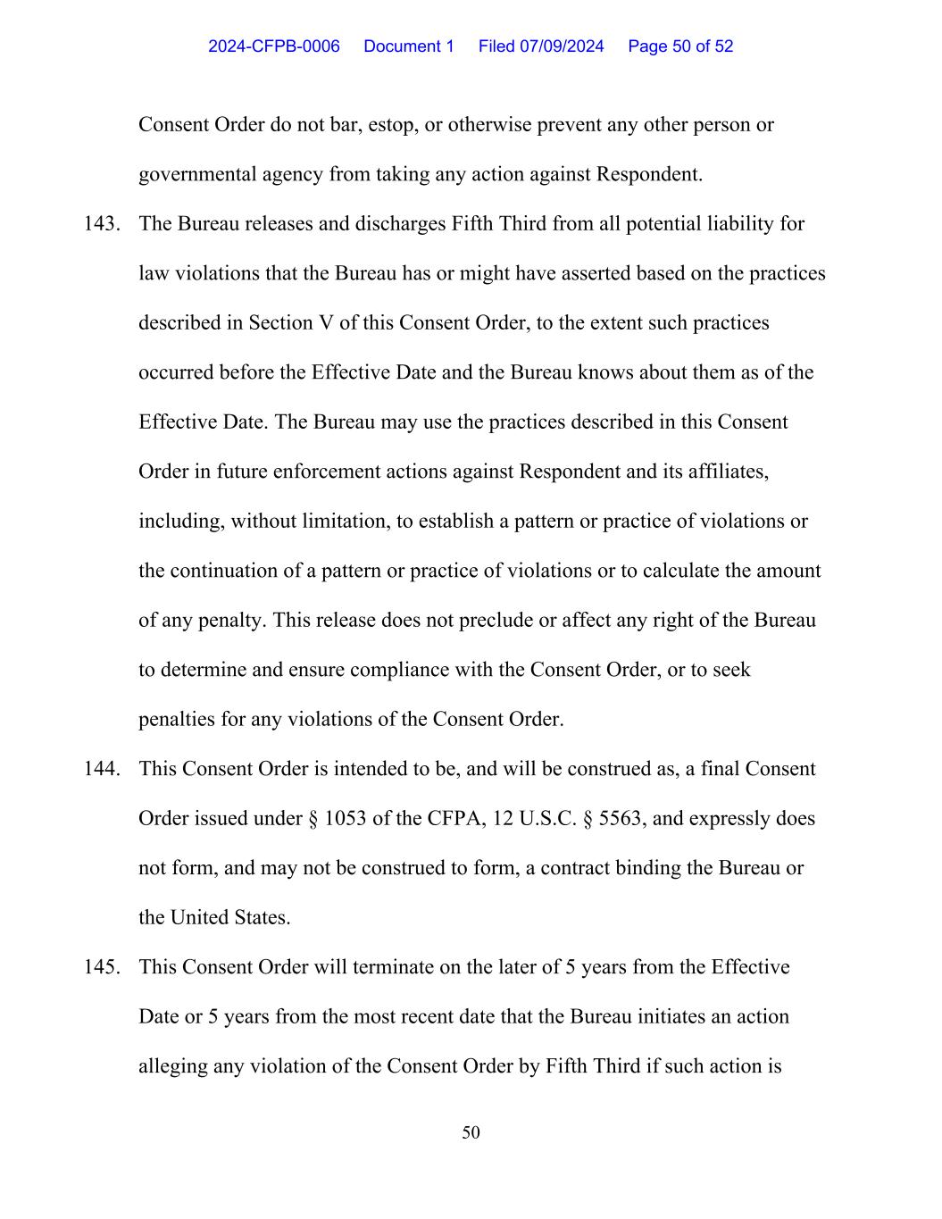 50 Consent Order do not bar, estop, or otherwise prevent any other person or governmental agency from taking any action against Respondent. 143. The Bureau releases and discharges Fifth Third from all potential liability for law violations that the Bureau has or might have asserted based on the practices described in Section V of this Consent Order, to the extent such practices occurred before the Effective Date and the Bureau knows about them as of the Effective Date. The Bureau may use the practices described in this Consent Order in future enforcement actions against Respondent and its affiliates, including, without limitation, to establish a pattern or practice of violations or the continuation of a pattern or practice of violations or to calculate the amount of any penalty. This release does not preclude or affect any right of the Bureau to determine and ensure compliance with the Consent Order, or to seek penalties for any violations of the Consent Order. 144. This Consent Order is intended to be, and will be construed as, a final Consent Order issued under § 1053 of the CFPA, 12 U.S.C. § 5563, and expressly does not form, and may not be construed to form, a contract binding the Bureau or the United States. 145. This Consent Order will terminate on the later of 5 years from the Effective Date or 5 years from the most recent date that the Bureau initiates an action alleging any violation of the Consent Order by Fifth Third if such action is 2024-CFPB-0006 Document 1 Filed 07/09/2024 Page 50 of 52