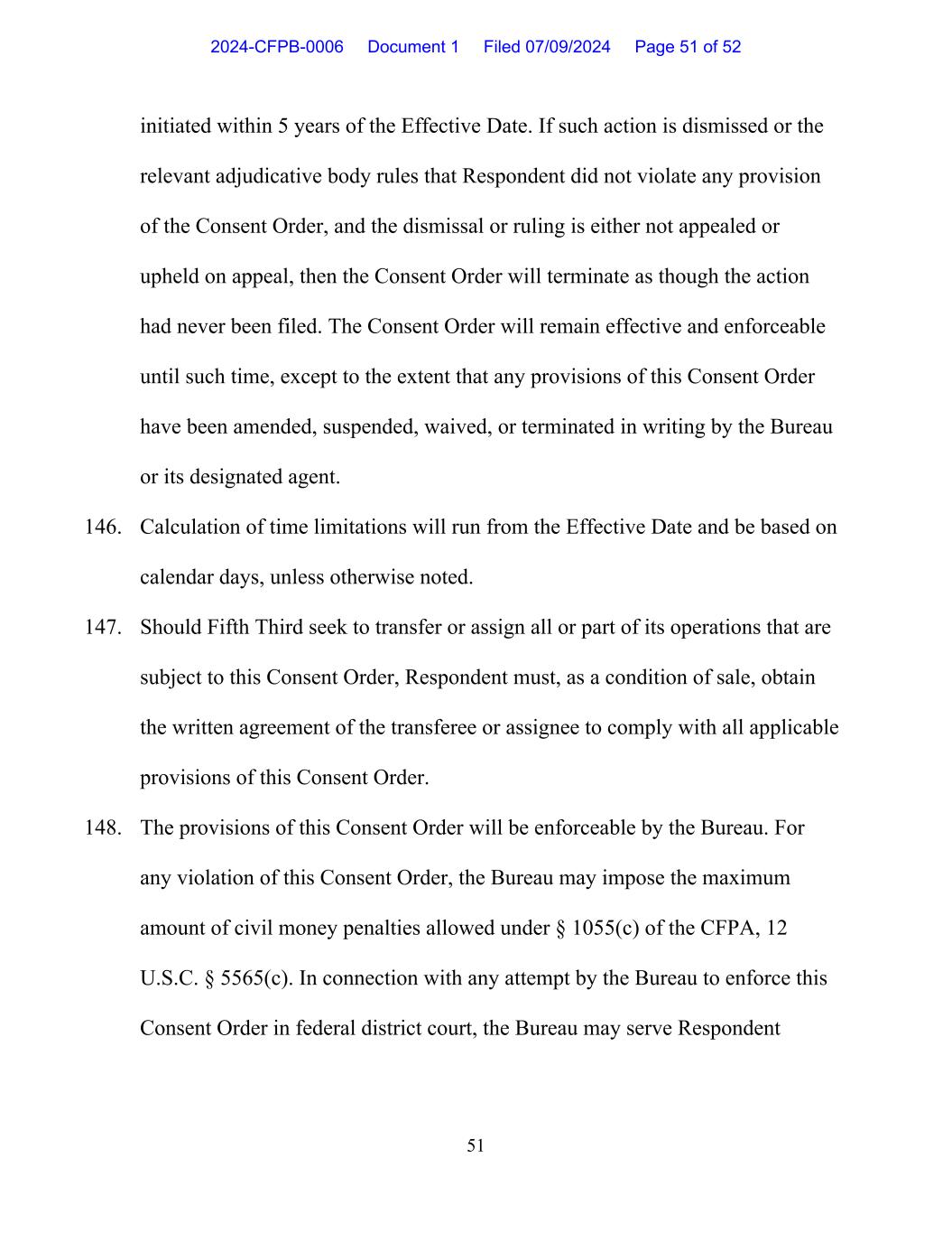 51 initiated within 5 years of the Effective Date. If such action is dismissed or the relevant adjudicative body rules that Respondent did not violate any provision of the Consent Order, and the dismissal or ruling is either not appealed or upheld on appeal, then the Consent Order will terminate as though the action had never been filed. The Consent Order will remain effective and enforceable until such time, except to the extent that any provisions of this Consent Order have been amended, suspended, waived, or terminated in writing by the Bureau or its designated agent. 146. Calculation of time limitations will run from the Effective Date and be based on calendar days, unless otherwise noted. 147. Should Fifth Third seek to transfer or assign all or part of its operations that are subject to this Consent Order, Respondent must, as a condition of sale, obtain the written agreement of the transferee or assignee to comply with all applicable provisions of this Consent Order. 148. The provisions of this Consent Order will be enforceable by the Bureau. For any violation of this Consent Order, the Bureau may impose the maximum amount of civil money penalties allowed under § 1055(c) of the CFPA, 12 U.S.C. § 5565(c). In connection with any attempt by the Bureau to enforce this Consent Order in federal district court, the Bureau may serve Respondent 2024-CFPB-0006 Document 1 Filed 07/09/2024 Page 51 of 52