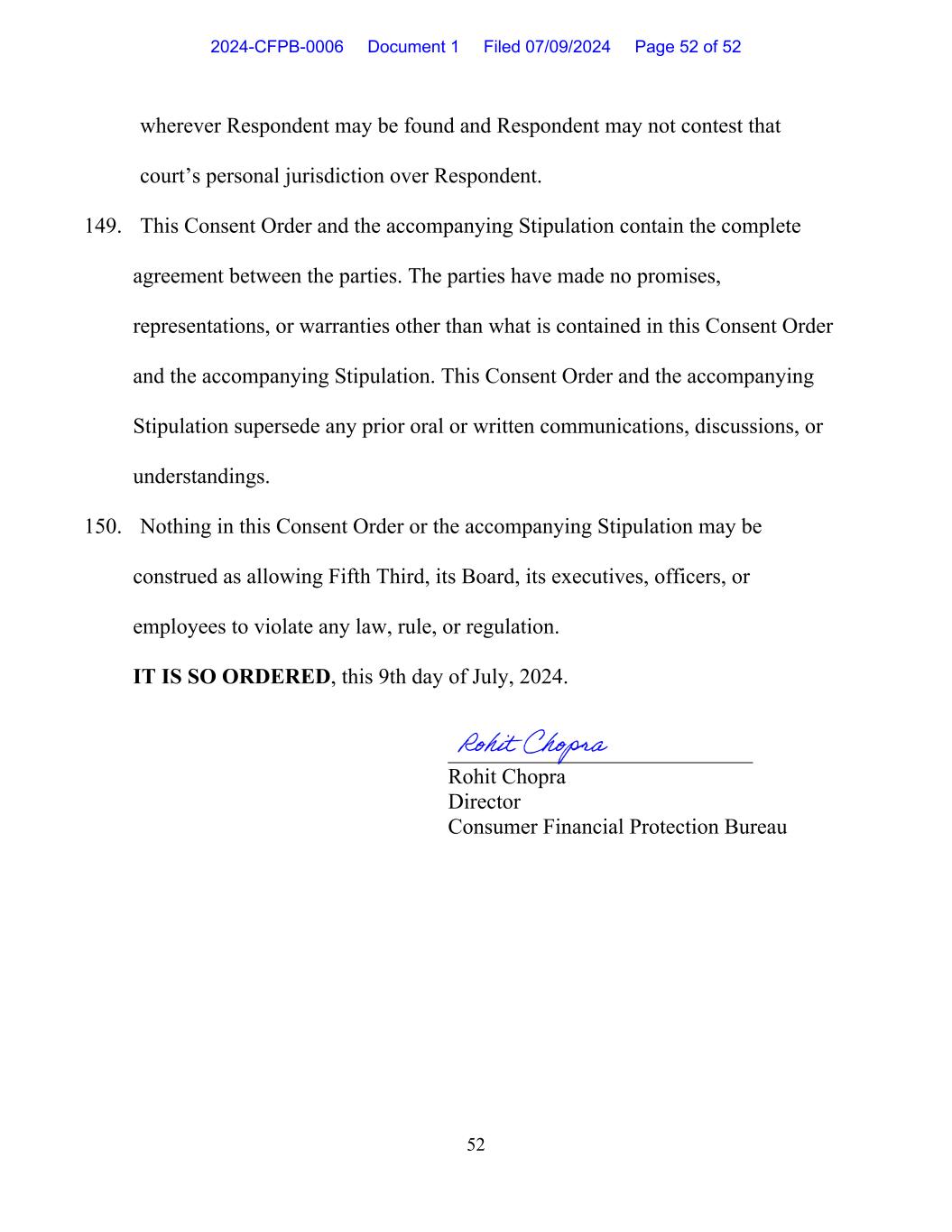 52 wherever Respondent may be found and Respondent may not contest that court’s personal jurisdiction over Respondent. 149. This Consent Order and the accompanying Stipulation contain the complete agreement between the parties. The parties have made no promises, representations, or warranties other than what is contained in this Consent Order and the accompanying Stipulation. This Consent Order and the accompanying Stipulation supersede any prior oral or written communications, discussions, or understandings. 150. Nothing in this Consent Order or the accompanying Stipulation may be construed as allowing Fifth Third, its Board, its executives, officers, or employees to violate any law, rule, or regulation. IT IS SO ORDERED, this 9th day of July, 2024. ____________________________ Rohit Chopra Director Consumer Financial Protection Bureau ~ f 2024-CFPB-0006 Document 1 Filed 07/09/2024 Page 52 of 52