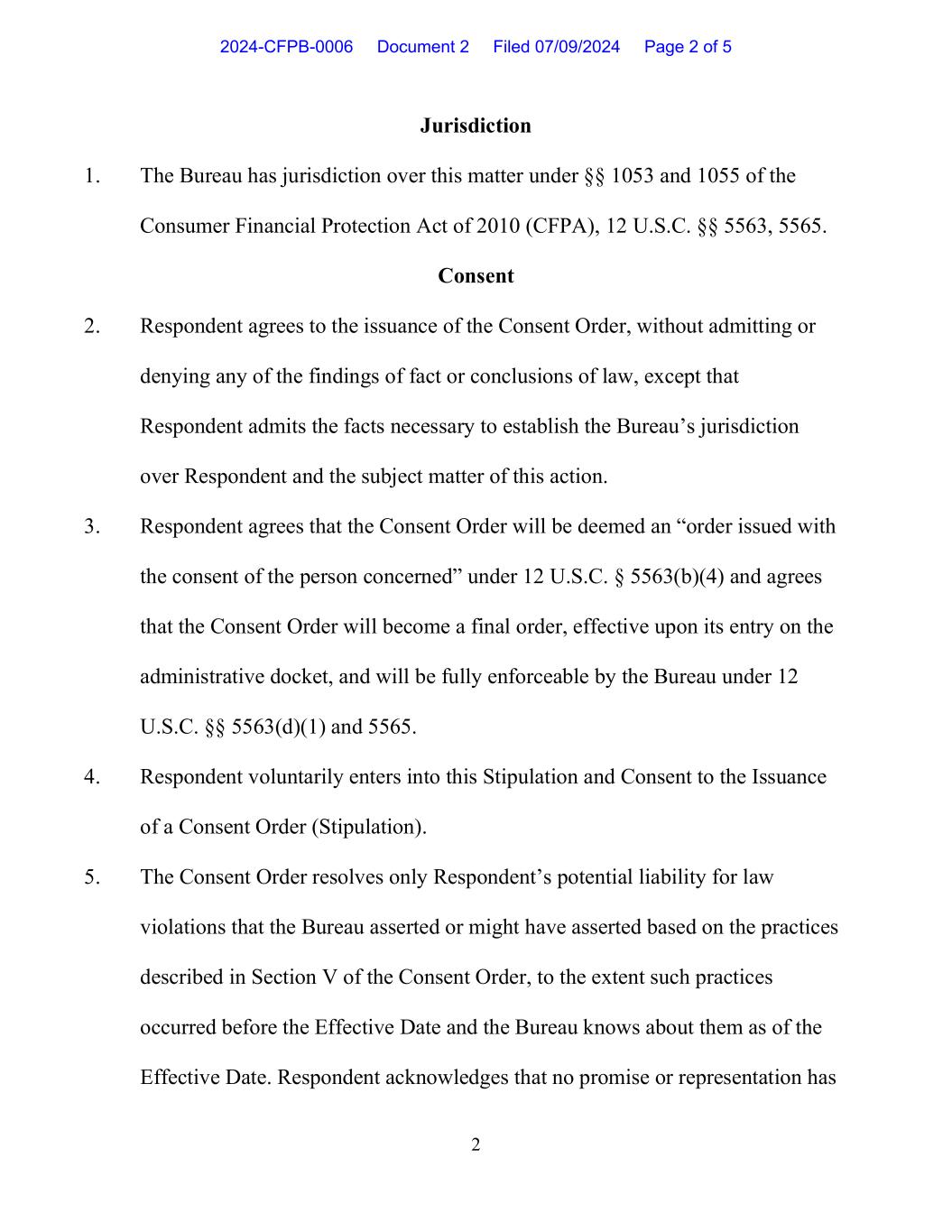 2 Jurisdiction 1. The Bureau has jurisdiction over this matter under §§ 1053 and 1055 of the Consumer Financial Protection Act of 2010 (CFPA), 12 U.S.C. §§ 5563, 5565. Consent 2. Respondent agrees to the issuance of the Consent Order, without admitting or denying any of the findings of fact or conclusions of law, except that Respondent admits the facts necessary to establish the Bureau’s jurisdiction over Respondent and the subject matter of this action. 3. Respondent agrees that the Consent Order will be deemed an “order issued with the consent of the person concerned” under 12 U.S.C. § 5563(b)(4) and agrees that the Consent Order will become a final order, effective upon its entry on the administrative docket, and will be fully enforceable by the Bureau under 12 U.S.C. §§ 5563(d)(1) and 5565. 4. Respondent voluntarily enters into this Stipulation and Consent to the Issuance of a Consent Order (Stipulation). 5. The Consent Order resolves only Respondent’s potential liability for law violations that the Bureau asserted or might have asserted based on the practices described in Section V of the Consent Order, to the extent such practices occurred before the Effective Date and the Bureau knows about them as of the Effective Date. Respondent acknowledges that no promise or representation has 2024-CFPB-0006 Document 2 Filed 07/09/2024 Page 2 of 5