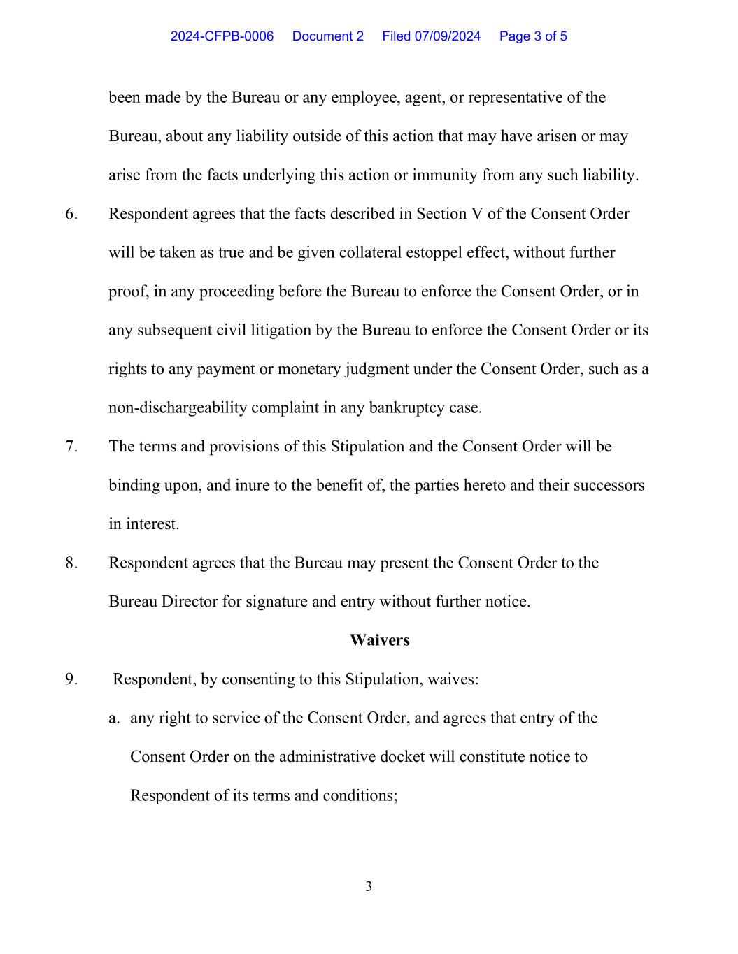 3 been made by the Bureau or any employee, agent, or representative of the Bureau, about any liability outside of this action that may have arisen or may arise from the facts underlying this action or immunity from any such liability. 6. Respondent agrees that the facts described in Section V of the Consent Order will be taken as true and be given collateral estoppel effect, without further proof, in any proceeding before the Bureau to enforce the Consent Order, or in any subsequent civil litigation by the Bureau to enforce the Consent Order or its rights to any payment or monetary judgment under the Consent Order, such as a non-dischargeability complaint in any bankruptcy case. 7. The terms and provisions of this Stipulation and the Consent Order will be binding upon, and inure to the benefit of, the parties hereto and their successors in interest. 8. Respondent agrees that the Bureau may present the Consent Order to the Bureau Director for signature and entry without further notice. Waivers 9. Respondent, by consenting to this Stipulation, waives: a. any right to service of the Consent Order, and agrees that entry of the Consent Order on the administrative docket will constitute notice to Respondent of its terms and conditions; 2024-CFPB-0006 Document 2 Filed 07/09/2024 Page 3 of 5