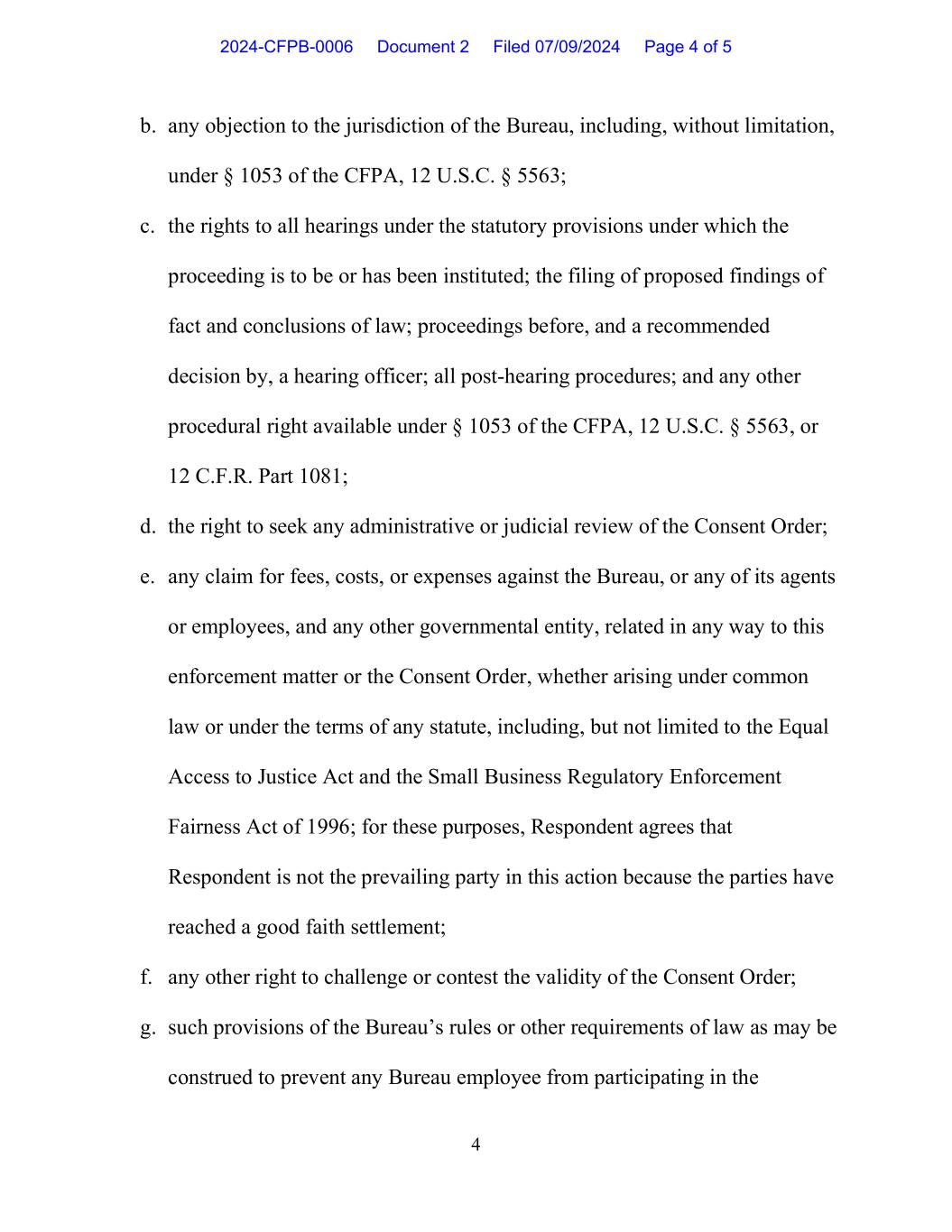 4 b. any objection to the jurisdiction of the Bureau, including, without limitation, under § 1053 of the CFPA, 12 U.S.C. § 5563; c. the rights to all hearings under the statutory provisions under which the proceeding is to be or has been instituted; the filing of proposed findings of fact and conclusions of law; proceedings before, and a recommended decision by, a hearing officer; all post-hearing procedures; and any other procedural right available under § 1053 of the CFPA, 12 U.S.C. § 5563, or 12 C.F.R. Part 1081; d. the right to seek any administrative or judicial review of the Consent Order; e. any claim for fees, costs, or expenses against the Bureau, or any of its agents or employees, and any other governmental entity, related in any way to this enforcement matter or the Consent Order, whether arising under common law or under the terms of any statute, including, but not limited to the Equal Access to Justice Act and the Small Business Regulatory Enforcement Fairness Act of 1996; for these purposes, Respondent agrees that Respondent is not the prevailing party in this action because the parties have reached a good faith settlement; f. any other right to challenge or contest the validity of the Consent Order; g. such provisions of the Bureau’s rules or other requirements of law as may be construed to prevent any Bureau employee from participating in the 2024-CFPB-0006 Document 2 Filed 07/09/2024 Page 4 of 5