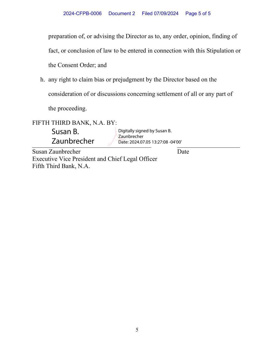 5 preparation of, or advising the Director as to, any order, opinion, finding of fact, or conclusion of law to be entered in connection with this Stipulation or the Consent Order; and h. any right to claim bias or prejudgment by the Director based on the consideration of or discussions concerning settlement of all or any part of the proceeding. FIFTH THIRD BANK, N.A. BY: ______________________________________ ____________________ Susan Zaunbrecher Date Executive Vice President and Chief Legal Officer Fifth Third Bank, N.A. Susan B. Zaunbrecher Digitally signed by Susan B. Zaunbrecher Date: 2024.07.05 13:27:08 -04'00' y 2024-CFPB-0006 Document 2 Filed 07/09/2024 Page 5 of 5