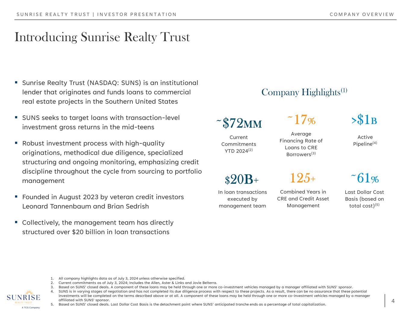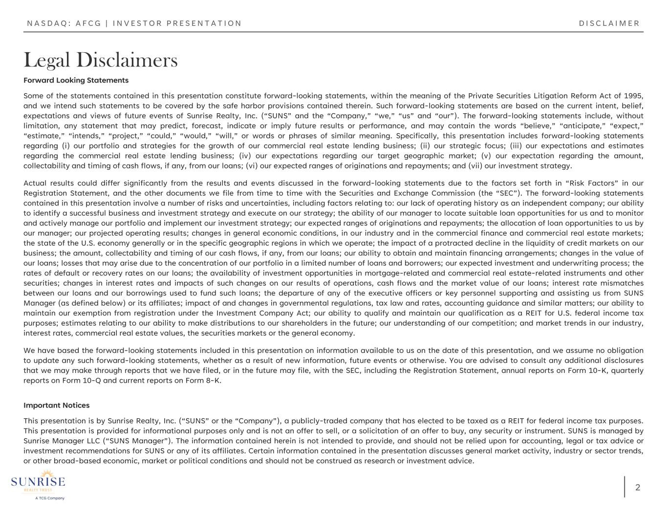 2 A TCG Company Legal Disclaimers Forward Looking Statements Some of the statements contained in this presentation constitute forward-looking statements, within the meaning of the Private Securities Litigation Reform Act of 1995, and we intend such statements to be covered by the safe harbor provisions contained therein. Such forward-looking statements are based on the current intent, belief, expectations and views of future events of Sunrise Realty, Inc. (“SUNS” and the “Company,” “we,” “us” and “our”). The forward-looking statements include, without limitation, any statement that may predict, forecast, indicate or imply future results or performance, and may contain the words “believe,” “anticipate,” “expect,” “estimate,” “intends,” “project,” “could,” “would,” “will,” or words or phrases of similar meaning. Specifically, this presentation includes forward-looking statements regarding (i) our portfolio and strategies for the growth of our commercial real estate lending business; (ii) our strategic focus; (iii) our expectations and estimates regarding the commercial real estate lending business; (iv) our expectations regarding our target geographic market; (v) our expectation regarding the amount, collectability and timing of cash flows, if any, from our loans; (vi) our expected ranges of originations and repayments; and (vii) our investment strategy. Actual results could differ significantly from the results and events discussed in the forward-looking statements due to the factors set forth in “Risk Factors” in our Registration Statement, and the other documents we file from time to time with the Securities and Exchange Commission (the “SEC”). The forward-looking statements contained in this presentation involve a number of risks and uncertainties, including factors relating to: our lack of operating history as an independent company; our ability to identify a successful business and investment strategy and execute on our strategy; the ability of our manager to locate suitable loan opportunities for us and to monitor and actively manage our portfolio and implement our investment strategy; our expected ranges of originations and repayments; the allocation of loan opportunities to us by our manager; our projected operating results; changes in general economic conditions, in our industry and in the commercial finance and commercial real estate markets; the state of the U.S. economy generally or in the specific geographic regions in which we operate; the impact of a protracted decline in the liquidity of credit markets on our business; the amount, collectability and timing of our cash flows, if any, from our loans; our ability to obtain and maintain financing arrangements; changes in the value of our loans; losses that may arise due to the concentration of our portfolio in a limited number of loans and borrowers; our expected investment and underwriting process; the rates of default or recovery rates on our loans; the availability of investment opportunities in mortgage-related and commercial real estate-related instruments and other securities; changes in interest rates and impacts of such changes on our results of operations, cash flows and the market value of our loans; interest rate mismatches between our loans and our borrowings used to fund such loans; the departure of any of the executive officers or key personnel supporting and assisting us from SUNS Manager (as defined below) or its affiliates; impact of and changes in governmental regulations, tax law and rates, accounting guidance and similar matters; our ability to maintain our exemption from registration under the Investment Company Act; our ability to qualify and maintain our qualification as a REIT for U.S. federal income tax purposes; estimates relating to our ability to make distributions to our shareholders in the future; our understanding of our competition; and market trends in our industry, interest rates, commercial real estate values, the securities markets or the general economy. We have based the forward-looking statements included in this presentation on information available to us on the date of this presentation, and we assume no obligation to update any such forward-looking statements, whether as a result of new information, future events or otherwise. You are advised to consult any additional disclosures that we may make through reports that we have filed, or in the future may file, with the SEC, including the Registration Statement, annual reports on Form 10-K, quarterly reports on Form 10-Q and current reports on Form 8-K. Important Notices This presentation is by Sunrise Realty, Inc. (“SUNS” or the “Company”), a publicly-traded company that has elected to be taxed as a REIT for federal income tax purposes. This presentation is provided for informational purposes only and is not an offer to sell, or a solicitation of an offer to buy, any security or instrument. SUNS is managed by Sunrise Manager LLC (“SUNS Manager”). The information contained herein is not intended to provide, and should not be relied upon for accounting, legal or tax advice or investment recommendations for SUNS or any of its affiliates. Certain information contained in the presentation discusses general market activity, industry or sector trends, or other broad-based economic, market or political conditions and should not be construed as research or investment advice. D I S C L A I M E RN A S D A Q : A F C G | I N V E S T O R P R E S E N T A T I O N