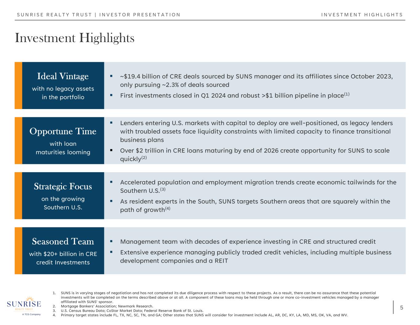 4 A TCG Company Introducing Sunrise Realty Trust Sunrise Realty Trust (NASDAQ: SUNS) is an institutional lender that originates and funds loans to commercial real estate projects in the Southern United States SUNS seeks to target loans with transaction-level investment gross returns in the mid-teens Robust investment process with high-quality originations, methodical due diligence, specialized structuring and ongoing monitoring, emphasizing credit discipline throughout the cycle from sourcing to portfolio management Founded in August 2023 by veteran credit investors Leonard Tannenbaum and Brian Sedrish Collectively, the management team has directly structured over $20 billion in loan transactions C O M P A N Y O V E R V I E WS U N R I S E R E A L T Y T R U S T | I N V E S T O R P R E S E N T A T I O N 1. All company highlights data as of July 3, 2024 unless otherwise specified. 2. Current commitments as of July 3, 2024; Includes the Allen, Aster & Links and Jovie Belterra. 3. Based on SUNS’ closed deals. A component of these loans may be held through one or more co-investment vehicles managed by a manager affiliated with SUNS’ sponsor. 4. SUNS is in varying stages of negotiation and has not completed its due diligence process with respect to these projects. As a result, there can be no assurance that these potential investments will be completed on the terms described above or at all. A component of these loans may be held through one or more co-investment vehicles managed by a manager affiliated with SUNS' sponsor. 5. Based on SUNS’ closed deals. Last Dollar Cost Basis is the detachment point where SUNS’ anticipated tranche ends as a percentage of total capitalization. Combined Years in CRE and Credit Asset Management ~61% Last Dollar Cost Basis (based on total cost)(5) 125+ In loan transactions executed by management team ~17% Average Financing Rate of Loans to CRE Borrowers(3) >$1B Active Pipeline(4) ~$72MM Current Commitments YTD 2024(2) $20B+ Company Highlights(1)
