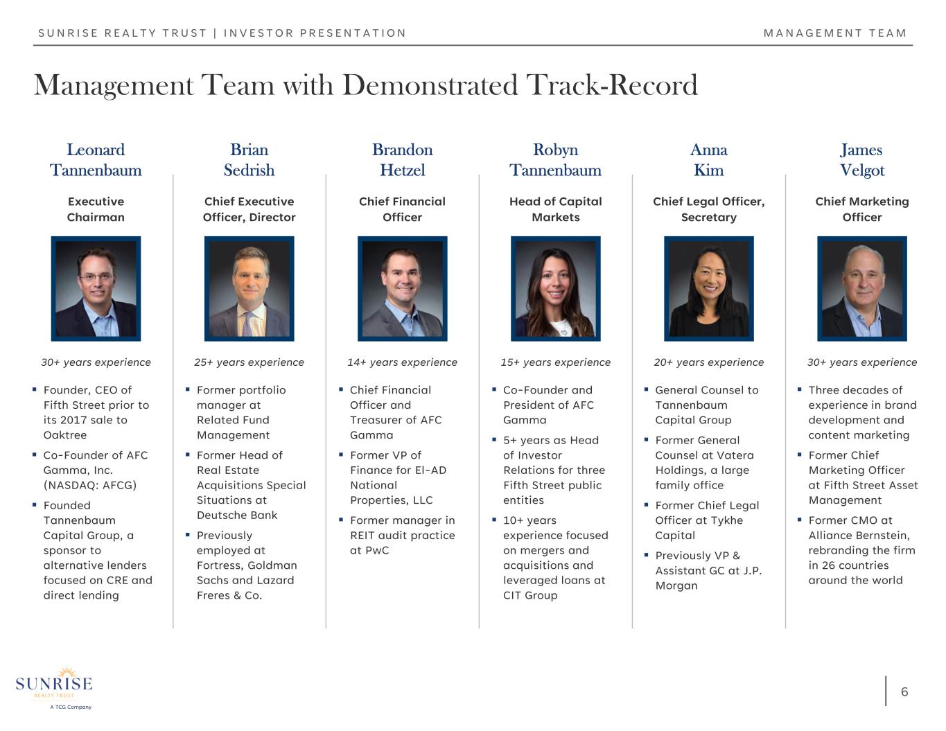5 A TCG Company Investment Highlights Lenders entering U.S. markets with capital to deploy are well-positioned, as legacy lenders with troubled assets face liquidity constraints with limited capacity to finance transitional business plans Over $2 trillion in CRE loans maturing by end of 2026 create opportunity for SUNS to scale quickly(2) Opportune Time with loan maturities looming Accelerated population and employment migration trends create economic tailwinds for the Southern U.S.(3) As resident experts in the South, SUNS targets Southern areas that are squarely within the path of growth(4) Strategic Focus on the growing Southern U.S. Management team with decades of experience investing in CRE and structured credit Extensive experience managing publicly traded credit vehicles, including multiple business development companies and a REIT Seasoned Team with $20+ billion in CRE credit Investments ~$19.4 billion of CRE deals sourced by SUNS manager and its affiliates since October 2023, only pursuing ~2.3% of deals sourced First investments closed in Q1 2024 and robust >$1 billion pipeline in place(1) Ideal Vintage with no legacy assets in the portfolio I N V E S T M E N T H I G H L I G H T SS U N R I S E R E A L T Y T R U S T | I N V E S T O R P R E S E N T A T I O N 1. SUNS is in varying stages of negotiation and has not completed its due diligence process with respect to these projects. As a result, there can be no assurance that these potential investments will be completed on the terms described above or at all. A component of these loans may be held through one or more co-investment vehicles managed by a manager affiliated with SUNS' sponsor. 2. Mortgage Bankers’ Association; Newmark Research. 3. U.S. Census Bureau Data; CoStar Market Data; Federal Reserve Bank of St. Louis. 4. Primary target states include FL, TX, NC, SC, TN, and GA; Other states that SUNS will consider for investment include AL, AR, DC, KY, LA, MD, MS, OK, VA, and WV.