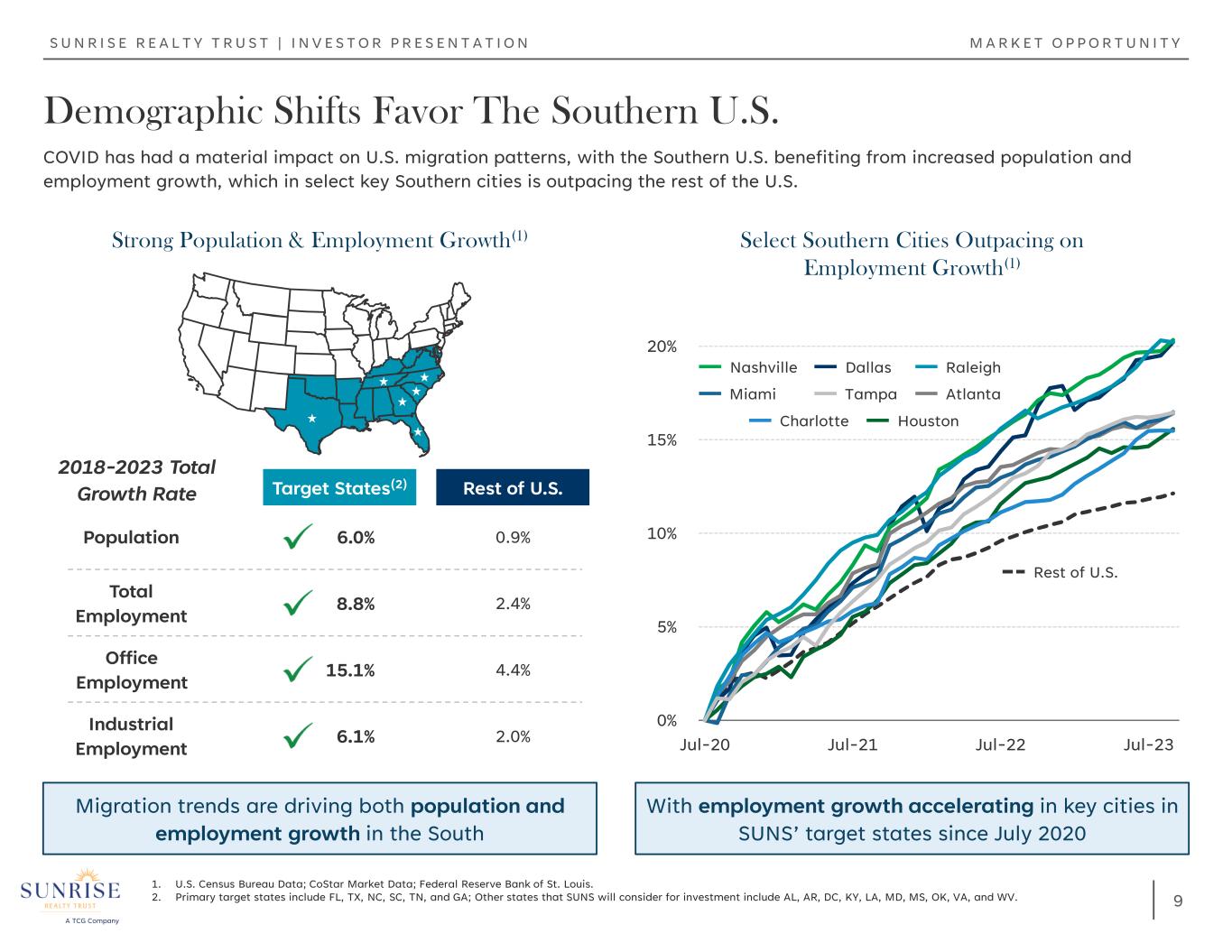 9 A TCG Company Demographic Shifts Favor The Southern U.S. M A R K E T O P P O R T U N I T YS U N R I S E R E A L T Y T R U S T | I N V E S T O R P R E S E N T A T I O N Select Southern Cities Outpacing on Employment Growth(1) Strong Population & Employment Growth(1) Migration trends are driving both population and employment growth in the South COVID has had a material impact on U.S. migration patterns, with the Southern U.S. benefiting from increased population and employment growth, which in select key Southern cities is outpacing the rest of the U.S. 2018-2023 Total Growth Rate Rest of U.S.Target States(2) Population 0.9%6.0% Total Employment 2.4%8.8% Office Employment 4.4%15.1% Industrial Employment 2.0%6.1% RaleighDallasNashville Tampa AtlantaMiami Charlotte Houston Rest of U.S. (5%) 0% 5% 10% 15% 20% Jul-20 Jul-21 Jul-22 Jul-23 With employment growth accelerating in key cities in SUNS’ target states since July 2020 1. U.S. Census Bureau Data; CoStar Market Data; Federal Reserve Bank of St. Louis. 2. Primary target states include FL, TX, NC, SC, TN, and GA; Other states that SUNS will consider for investment include AL, AR, DC, KY, LA, MD, MS, OK, VA, and WV.