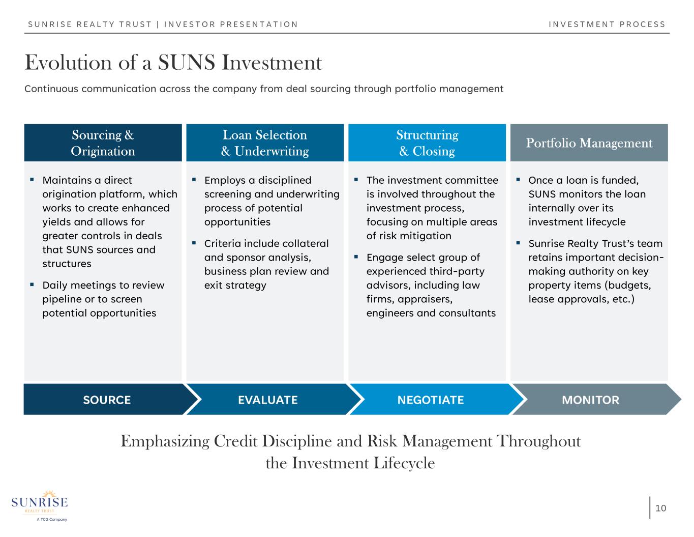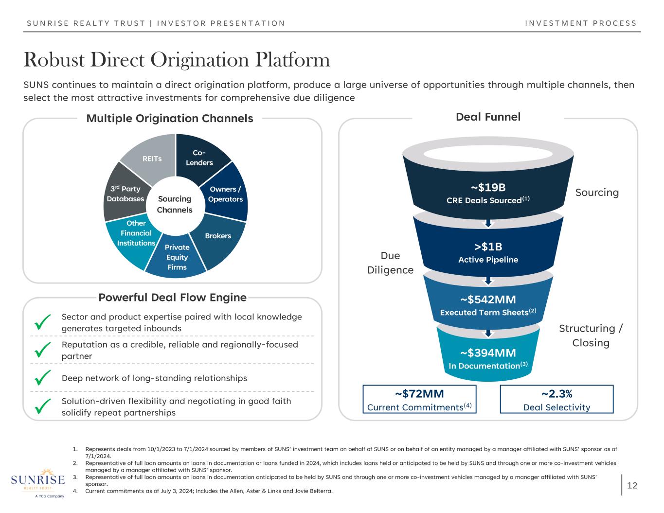 11 A TCG Company Sponsor Market Business Plan Transaction Highly-Selective Investment Process(1) Sunrise Realty Trust takes a patient approach to investing, targeting opportunities with clear potential for value creation that meet a defined set of investment criteria Supply constrained markets with recognizable demand drivers Superior location within market Readily executable strategy to stabilize property Ability to refinance upon stabilization or protect in downside case Significant equity cushion to absorb potential losses Conservative leverage provides strategic flexibility and mitigates risk Institutional sponsors and operators with track records and expertise Alignment of interests through appropriate capital commitments Positive Market Fundamentals Sound Business Plan Substantial Margin of Safety Strong Financial Sponsor Debt Structure & Terms I N V E S T M E N T P R O C E S SS U N R I S E R E A L T Y T R U S T | I N V E S T O R P R E S E N T A T I O N Target Investment Attributes 1. Disclaimer: The due diligence process in regard to our investment opportunities may not reveal all facts relevant to an investment and, as a result, we may experience losses, which could materially and adversely affect us.