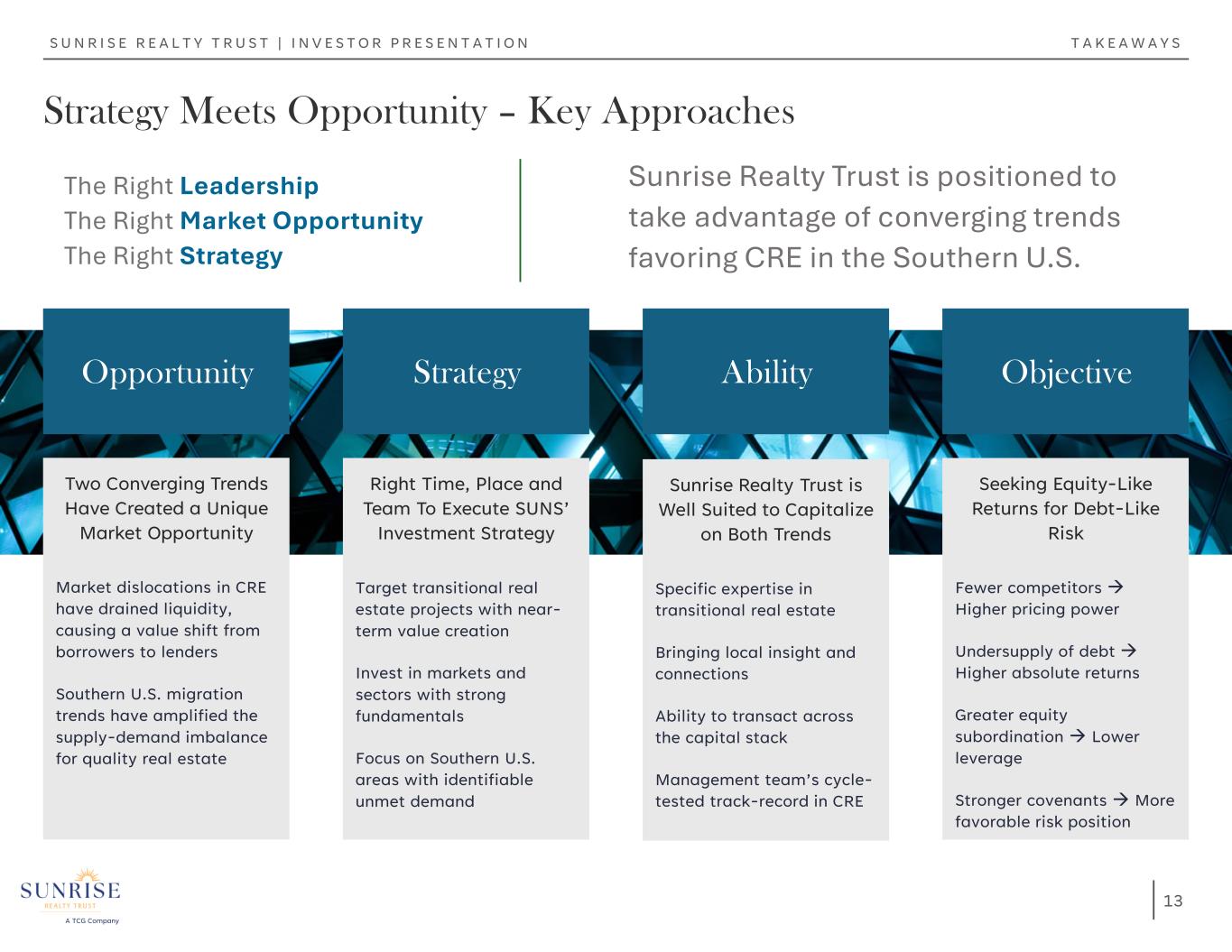 12 A TCG Company Robust Direct Origination Platform I N V E S T M E N T P R O C E S S 1. Represents deals from 10/1/2023 to 7/1/2024 sourced by members of SUNS’ investment team on behalf of SUNS or on behalf of an entity managed by a manager affiliated with SUNS’ sponsor as of 7/1/2024. 2. Representative of full loan amounts on loans in documentation or loans funded in 2024, which includes loans held or anticipated to be held by SUNS and through one or more co-investment vehicles managed by a manager affiliated with SUNS’ sponsor. 3. Representative of full loan amounts on loans in documentation anticipated to be held by SUNS and through one or more co-investment vehicles managed by a manager affiliated with SUNS’ sponsor. 4. Current commitments as of July 3, 2024; Includes the Allen, Aster & Links and Jovie Belterra. SUNS continues to maintain a direct origination platform, produce a large universe of opportunities through multiple channels, then select the most attractive investments for comprehensive due diligence S U N R I S E R E A L T Y T R U S T | I N V E S T O R P R E S E N T A T I O N Co- Lenders Owners / Operators Brokers Private Equity Firms Other Financial Institutions 3rd Party Databases REITs Sourcing Channels Due Diligence Sourcing Structuring / Closing ~$542MM Executed Term Sheets(2) ~$394MM In Documentation(3) ~$19B CRE Deals Sourced(1) >$1B Active Pipeline Deep network of long-standing relationships Sector and product expertise paired with local knowledge generates targeted inbounds Reputation as a credible, reliable and regionally-focused partner Solution-driven flexibility and negotiating in good faith solidify repeat partnerships ~2.3% Deal Selectivity Multiple Origination Channels Powerful Deal Flow Engine Deal Funnel ~$72MM Current Commitments(4)