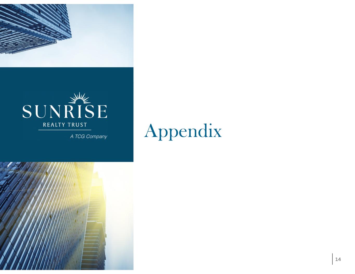 13 A TCG Company Strategy Meets Opportunity – Key Approaches Right Time, Place and Team To Execute SUNS’ Investment Strategy Two Converging Trends Have Created a Unique Market Opportunity Sunrise Realty Trust is Well Suited to Capitalize on Both Trends Seeking Equity-Like Returns for Debt-Like Risk Target transitional real estate projects with near- term value creation Invest in markets and sectors with strong fundamentals Focus on Southern U.S. areas with identifiable unmet demand Fewer competitors Higher pricing power Undersupply of debt Higher absolute returns Greater equity subordination Lower leverage Stronger covenants More favorable risk position Market dislocations in CRE have drained liquidity, causing a value shift from borrowers to lenders Southern U.S. migration trends have amplified the supply-demand imbalance for quality real estate Specific expertise in transitional real estate Bringing local insight and connections Ability to transact across the capital stack Management team’s cycle- tested track-record in CRE The Right Leadership The Right Market Opportunity The Right Strategy Sunrise Realty Trust is positioned to take advantage of converging trends favoring CRE in the Southern U.S. StrategyOpportunity Ability Objective T A K E A W A Y SS U N R I S E R E A L T Y T R U S T | I N V E S T O R P R E S E N T A T I O N
