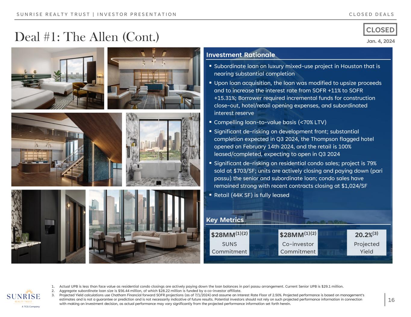 15 A TCG Company Deal #1: The Allen C L O S E D D E A L SS U N R I S E R E A L T Y T R U S T | I N V E S T O R P R E S E N T A T I O N 1. Actual UPB is less than face value as residential condo closings are actively paying down the loan balances in pari passu arrangement. Current Senior UPB is $29.1 million as of 7/8/2024. 2. Aggregate subordinate loan size is $56.44 million, of which $28.22 million is funded by SUNS and the remaining by a co-investor affiliate. 3. Current total rate as of 7/1/2024. THE ALLEN HIGHLIGHTS Houston, TXLOCATION Mixed UsePROPERTY TYPE Loan PurchaseINVESTMENT TYPE Subordinate LoanINVESTMENT STRUCTURE $115MMSENIOR LOAN SIZE(1) $44.6MMTOTAL SUBORDINATE LOAN SIZE(1)(2) SOFR + 15.31% (20.64% current rate(3)) SUBORDINATE CASH INTEREST RATE November 2024MATURITY DATE Sunrise Realty TrustSUBORDINATE LENDER CLOSED Jan. 4, 2024