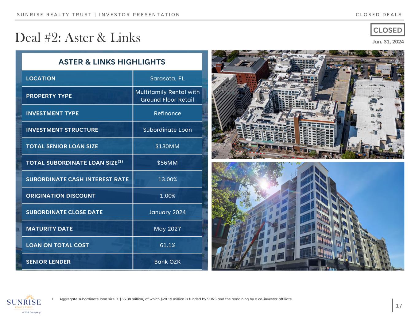 16 A TCG Company Deal #1: The Allen (Cont.) C L O S E D D E A L SS U N R I S E R E A L T Y T R U S T | I N V E S T O R P R E S E N T A T I O N 1. Actual UPB is less than face value as residential condo closings are actively paying down the loan balances in pari passu arrangement. Current Senior UPB is $29.1 million. 2. Aggregate subordinate loan size is $56.44 million, of which $28.22 million is funded by a co-investor affiliate. 3. Projected Yield calculations use Chatham Financial forward SOFR projections (as of 7/1/2024) and assume an Interest Rate Floor of 2.50%. Projected performance is based on management's estimates and is not a guarantee or prediction and is not necessarily indicative of future results. Potential investors should not rely on such projected performance information in connection with making an investment decision, as actual performance may vary significantly from the projected performance information set forth herein. Investment Rationale Subordinate loan on luxury mixed-use project in Houston that is nearing substantial completion Upon loan acquisition, the loan was modified to upsize proceeds and to increase the interest rate from SOFR +11% to SOFR +15.31%; Borrower required incremental funds for construction close-out, hotel/retail opening expenses, and subordinated interest reserve Compelling loan-to-value basis (<70% LTV) Significant de-risking on development front; substantial completion expected in Q3 2024, the Thompson flagged hotel opened on February 14th 2024, and the retail is 100% leased/completed, expecting to open in Q3 2024 Significant de-risking on residential condo sales; project is 79% sold at $703/SF; units are actively closing and paying down (pari passu) the senior and subordinate loan; condo sales have remained strong with recent contracts closing at $1,024/SF Retail (44K SF) is fully leased Key Metrics $28MM(1)(2) SUNS Commitment $28MM(1)(2) Co-investor Commitment 20.2%(3) Projected Yield CLOSED Jan. 4, 2024