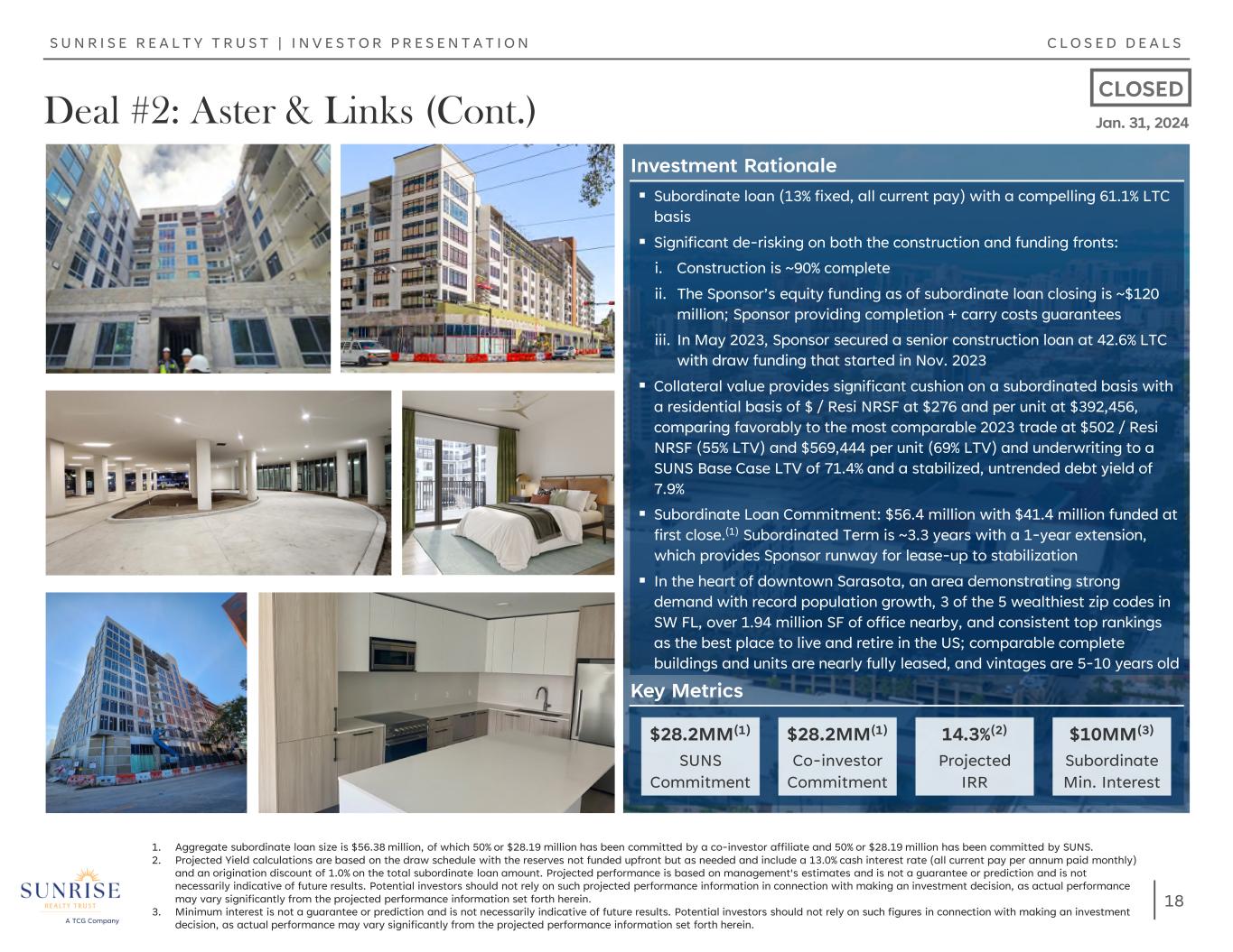 17 A TCG Company Deal #2: Aster & Links C L O S E D D E A L SS U N R I S E R E A L T Y T R U S T | I N V E S T O R P R E S E N T A T I O N 1. Aggregate subordinate loan size is $56.38 million, of which $28.19 million is funded by SUNS and the remaining by a co-investor affiliate. ASTER & LINKS HIGHLIGHTS Sarasota, FLLOCATION Multifamily Rental with Ground Floor Retail PROPERTY TYPE RefinanceINVESTMENT TYPE Subordinate LoanINVESTMENT STRUCTURE $130MMTOTAL SENIOR LOAN SIZE $56MMTOTAL SUBORDINATE LOAN SIZE(1) 13.00%SUBORDINATE CASH INTEREST RATE 1.00%ORIGINATION DISCOUNT January 2024SUBORDINATE CLOSE DATE May 2027MATURITY DATE 61.1%LOAN ON TOTAL COST Bank OZKSENIOR LENDER CLOSED Jan. 31, 2024