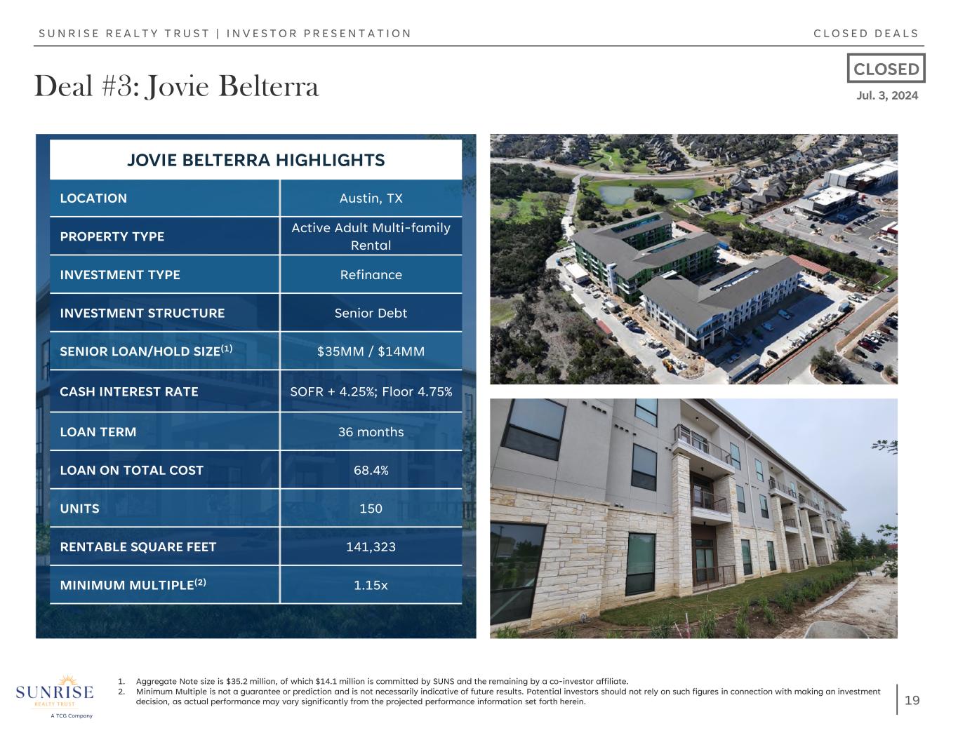 18 A TCG Company Deal #2: Aster & Links (Cont.) C L O S E D D E A L SS U N R I S E R E A L T Y T R U S T | I N V E S T O R P R E S E N T A T I O N 1. Aggregate subordinate loan size is $56.38 million, of which 50% or $28.19 million has been committed by a co-investor affiliate and 50% or $28.19 million has been committed by SUNS. 2. Projected Yield calculations are based on the draw schedule with the reserves not funded upfront but as needed and include a 13.0% cash interest rate (all current pay per annum paid monthly) and an origination discount of 1.0% on the total subordinate loan amount. Projected performance is based on management's estimates and is not a guarantee or prediction and is not necessarily indicative of future results. Potential investors should not rely on such projected performance information in connection with making an investment decision, as actual performance may vary significantly from the projected performance information set forth herein. 3. Minimum interest is not a guarantee or prediction and is not necessarily indicative of future results. Potential investors should not rely on such figures in connection with making an investment decision, as actual performance may vary significantly from the projected performance information set forth herein. CLOSED Jan. 31, 2024 Investment Rationale Subordinate loan (13% fixed, all current pay) with a compelling 61.1% LTC basis Significant de-risking on both the construction and funding fronts: i. Construction is ~90% complete ii. The Sponsor’s equity funding as of subordinate loan closing is ~$120 million; Sponsor providing completion + carry costs guarantees iii. In May 2023, Sponsor secured a senior construction loan at 42.6% LTC with draw funding that started in Nov. 2023 Collateral value provides significant cushion on a subordinated basis with a residential basis of $ / Resi NRSF at $276 and per unit at $392,456, comparing favorably to the most comparable 2023 trade at $502 / Resi NRSF (55% LTV) and $569,444 per unit (69% LTV) and underwriting to a SUNS Base Case LTV of 71.4% and a stabilized, untrended debt yield of 7.9% Subordinate Loan Commitment: $56.4 million with $41.4 million funded at first close.(1) Subordinated Term is ~3.3 years with a 1-year extension, which provides Sponsor runway for lease-up to stabilization In the heart of downtown Sarasota, an area demonstrating strong demand with record population growth, 3 of the 5 wealthiest zip codes in SW FL, over 1.94 million SF of office nearby, and consistent top rankings as the best place to live and retire in the US; comparable complete buildings and units are nearly fully leased, and vintages are 5-10 years old Key Metrics $28.2MM(1) SUNS Commitment $28.2MM(1) Co-investor Commitment $10MM(3) Subordinate Min. Interest 14.3%(2) Projected IRR