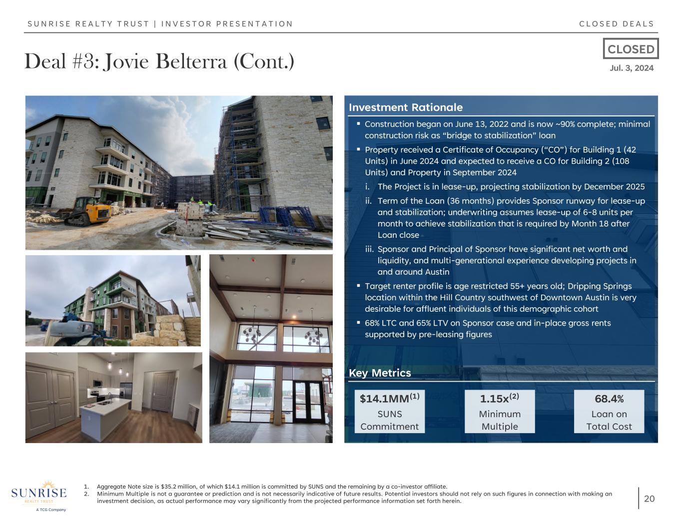 19 A TCG Company Deal #3: Jovie Belterra C L O S E D D E A L SS U N R I S E R E A L T Y T R U S T | I N V E S T O R P R E S E N T A T I O N 1. Aggregate Note size is $35.2 million, of which $14.1 million is committed by SUNS and the remaining by a co-investor affiliate. 2. Minimum Multiple is not a guarantee or prediction and is not necessarily indicative of future results. Potential investors should not rely on such figures in connection with making an investment decision, as actual performance may vary significantly from the projected performance information set forth herein. JOVIE BELTERRA HIGHLIGHTS Austin, TXLOCATION Active Adult Multi-family Rental PROPERTY TYPE RefinanceINVESTMENT TYPE Senior DebtINVESTMENT STRUCTURE $35MM / $14MMSENIOR LOAN/HOLD SIZE(1) SOFR + 4.25%; Floor 4.75%CASH INTEREST RATE 36 monthsLOAN TERM 68.4%LOAN ON TOTAL COST 150 UNITS 141,323RENTABLE SQUARE FEET 1.15xMINIMUM MULTIPLE(2) CLOSED Jul. 3, 2024