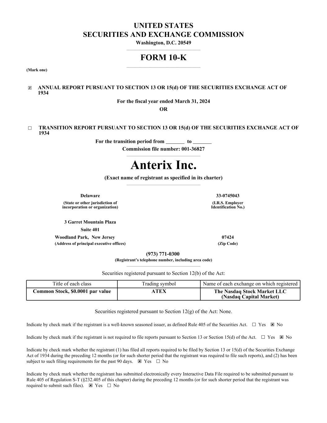 UNITED STATES SECURITIES AND EXCHANGE COMMISSION Washington, D.C. 20549 ______________________________________________ FORM 10-K ______________________________________________ (Mark one) ͏ ☒ ANNUAL REPORT PURSUANT TO SECTION 13 OR 15(d) OF THE SECURITIES EXCHANGE ACT OF 1934 For the fiscal year ended March 31, 2024 OR ͏ ☐ TRANSITION REPORT PURSUANT TO SECTION 13 OR 15(d) OF THE SECURITIES EXCHANGE ACT OF 1934 For the transition period from to Commission file number: 001-36827 ______________________________________________ Anterix Inc. (Exact name of registrant as specified in its charter) ______________________________________________ Delaware 33-0745043 (State or other jurisdiction of incorporation or organization) (I.R.S. Employer Identification No.) ͏ 3 Garret Mountain Plaza 07424 Suite 401 Woodland Park, New Jersey (Address of principal executive offices) (Zip Code) (973) 771-0300 (Registrant’s telephone number, including area code) ______________________________________________ Securities registered pursuant to Section 12(b) of the Act: Title of each class Trading symbol Name of each exchange on which registered Common Stock, $0.0001 par value ATEX The Nasdaq Stock Market LLC (Nasdaq Capital Market) Securities registered pursuant to Section 12(g) of the Act: None. Indicate by check mark if the registrant is a well-known seasoned issuer, as defined Rule 405 of the Securities Act. ☐ Yes ☒ No Indicate by check mark if the registrant is not required to file reports pursuant to Section 13 or Section 15(d) of the Act. ☐ Yes ☒ No Indicate by check mark whether the registrant (1) has filed all reports required to be filed by Section 13 or 15(d) of the Securities Exchange Act of 1934 during the preceding 12 months (or for such shorter period that the registrant was required to file such reports), and (2) has been subject to such filing requirements for the past 90 days. ☒ Yes ☐ No Indicate by check mark whether the registrant has submitted electronically every Interactive Data File required to be submitted pursuant to Rule 405 of Regulation S-T (§232.405 of this chapter) during the preceding 12 months (or for such shorter period that the registrant was required to submit such files). ☒ Yes ☐ No