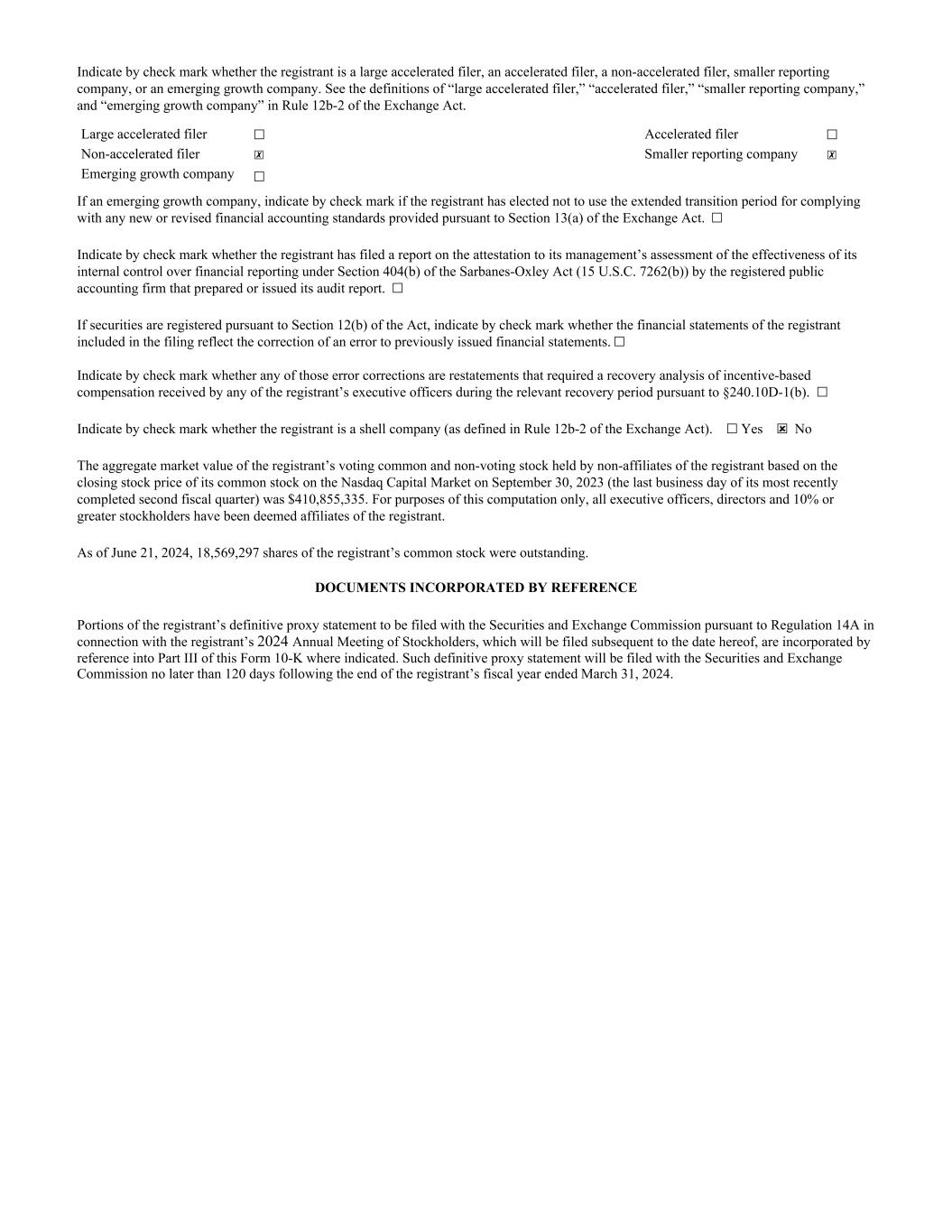 Indicate by check mark whether the registrant is a large accelerated filer, an accelerated filer, a non-accelerated filer, smaller reporting company, or an emerging growth company. See the definitions of “large accelerated filer,” “accelerated filer,” “smaller reporting company,” and “emerging growth company” in Rule 12b-2 of the Exchange Act. Large accelerated filer ☐ Accelerated filer ☐ Non-accelerated filer ☒ Smaller reporting company ☒ Emerging growth company ☐ If an emerging growth company, indicate by check mark if the registrant has elected not to use the extended transition period for complying with any new or revised financial accounting standards provided pursuant to Section 13(a) of the Exchange Act. ☐ Indicate by check mark whether the registrant has filed a report on the attestation to its management’s assessment of the effectiveness of its internal control over financial reporting under Section 404(b) of the Sarbanes-Oxley Act (15 U.S.C. 7262(b)) by the registered public accounting firm that prepared or issued its audit report. ☐ If securities are registered pursuant to Section 12(b) of the Act, indicate by check mark whether the financial statements of the registrant included in the filing reflect the correction of an error to previously issued financial statements. ☐ Indicate by check mark whether any of those error corrections are restatements that required a recovery analysis of incentive-based compensation received by any of the registrant’s executive officers during the relevant recovery period pursuant to §240.10D-1(b). ☐ Indicate by check mark whether the registrant is a shell company (as defined in Rule 12b-2 of the Exchange Act). ☐ Yes ☒ No The aggregate market value of the registrant’s voting common and non-voting stock held by non-affiliates of the registrant based on the closing stock price of its common stock on the Nasdaq Capital Market on September 30, 2023 (the last business day of its most recently completed second fiscal quarter) was $410,855,335. For purposes of this computation only, all executive officers, directors and 10% or greater stockholders have been deemed affiliates of the registrant. As of June 21, 2024, 18,569,297 shares of the registrant’s common stock were outstanding. DOCUMENTS INCORPORATED BY REFERENCE Portions of the registrant’s definitive proxy statement to be filed with the Securities and Exchange Commission pursuant to Regulation 14A in connection with the registrant’s 2024 Annual Meeting of Stockholders, which will be filed subsequent to the date hereof, are incorporated by reference into Part III of this Form 10-K where indicated. Such definitive proxy statement will be filed with the Securities and Exchange Commission no later than 120 days following the end of the registrant’s fiscal year ended March 31, 2024.