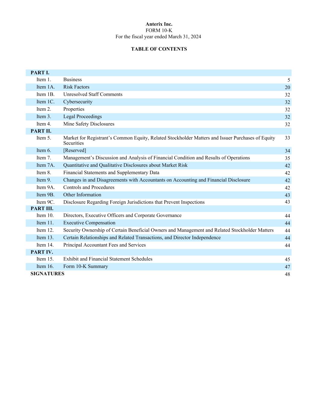 Anterix Inc. FORM 10-K For the fiscal year ended March 31, 2024 TABLE OF CONTENTS ͏ PART I. Item 1. Business 5 Item 1A. Risk Factors 20 Item 1B. Unresolved Staff Comments 32 Item 1C. Cybersecurity 32 Item 2. Properties 32 Item 3. Legal Proceedings 32 Item 4. Mine Safety Disclosures 32 PART II. Item 5. Market for Registrant’s Common Equity, Related Stockholder Matters and Issuer Purchases of Equity Securities 33 Item 6. [Reserved] 34 Item 7. Management’s Discussion and Analysis of Financial Condition and Results of Operations 35 Item 7A. Quantitative and Qualitative Disclosures about Market Risk 42 Item 8. Financial Statements and Supplementary Data 42 Item 9. Changes in and Disagreements with Accountants on Accounting and Financial Disclosure 42 Item 9A. Controls and Procedures 42 Item 9B. Other Information 43 Item 9C. Disclosure Regarding Foreign Jurisdictions that Prevent Inspections 43 PART III. Item 10. Directors, Executive Officers and Corporate Governance 44 Item 11. Executive Compensation 44 Item 12. Security Ownership of Certain Beneficial Owners and Management and Related Stockholder Matters 44 Item 13. Certain Relationships and Related Transactions, and Director Independence 44 Item 14. Principal Accountant Fees and Services 44 PART IV. Item 15. Exhibit and Financial Statement Schedules 45 Item 16. Form 10-K Summary 47 SIGNATURES 48