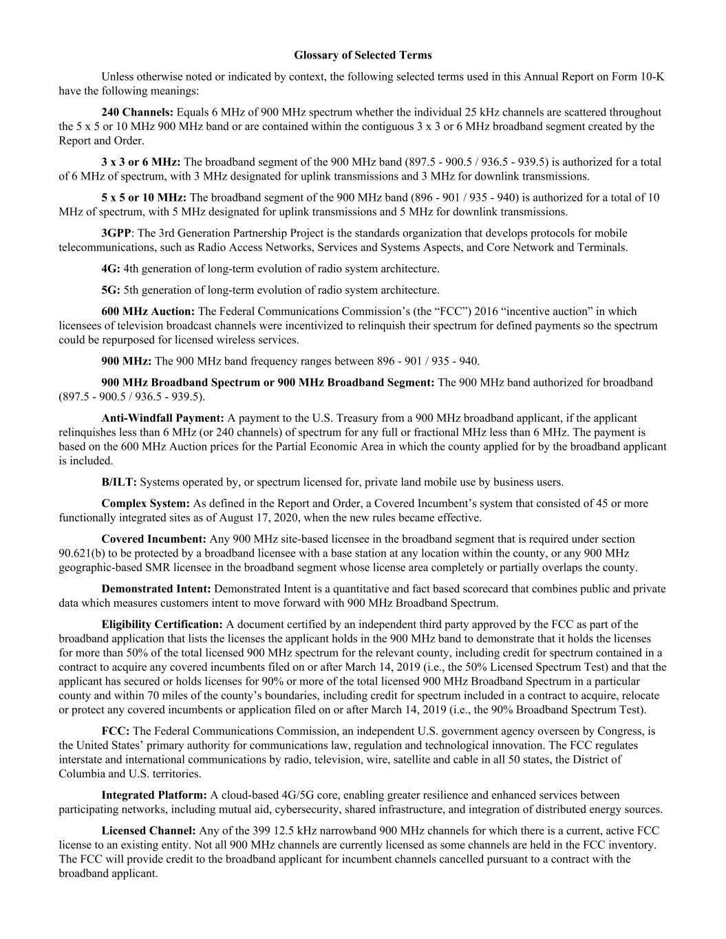 Glossary of Selected Terms Unless otherwise noted or indicated by context, the following selected terms used in this Annual Report on Form 10-K have the following meanings: 240 Channels: Equals 6 MHz of 900 MHz spectrum whether the individual 25 kHz channels are scattered throughout the 5 x 5 or 10 MHz 900 MHz band or are contained within the contiguous 3 x 3 or 6 MHz broadband segment created by the Report and Order. 3 x 3 or 6 MHz: The broadband segment of the 900 MHz band (897.5 - 900.5 / 936.5 - 939.5) is authorized for a total of 6 MHz of spectrum, with 3 MHz designated for uplink transmissions and 3 MHz for downlink transmissions. 5 x 5 or 10 MHz: The broadband segment of the 900 MHz band (896 - 901 / 935 - 940) is authorized for a total of 10 MHz of spectrum, with 5 MHz designated for uplink transmissions and 5 MHz for downlink transmissions. 3GPP: The 3rd Generation Partnership Project is the standards organization that develops protocols for mobile telecommunications, such as Radio Access Networks, Services and Systems Aspects, and Core Network and Terminals. 4G: 4th generation of long-term evolution of radio system architecture. 5G: 5th generation of long-term evolution of radio system architecture. 600 MHz Auction: The Federal Communications Commission’s (the “FCC”) 2016 “incentive auction” in which licensees of television broadcast channels were incentivized to relinquish their spectrum for defined payments so the spectrum could be repurposed for licensed wireless services. 900 MHz: The 900 MHz band frequency ranges between 896 - 901 / 935 - 940. 900 MHz Broadband Spectrum or 900 MHz Broadband Segment: The 900 MHz band authorized for broadband (897.5 - 900.5 / 936.5 - 939.5). Anti-Windfall Payment: A payment to the U.S. Treasury from a 900 MHz broadband applicant, if the applicant relinquishes less than 6 MHz (or 240 channels) of spectrum for any full or fractional MHz less than 6 MHz. The payment is based on the 600 MHz Auction prices for the Partial Economic Area in which the county applied for by the broadband applicant is included. B/ILT: Systems operated by, or spectrum licensed for, private land mobile use by business users. Complex System: As defined in the Report and Order, a Covered Incumbent’s system that consisted of 45 or more functionally integrated sites as of August 17, 2020, when the new rules became effective. Covered Incumbent: Any 900 MHz site-based licensee in the broadband segment that is required under section 90.621(b) to be protected by a broadband licensee with a base station at any location within the county, or any 900 MHz geographic-based SMR licensee in the broadband segment whose license area completely or partially overlaps the county. Demonstrated Intent: Demonstrated Intent is a quantitative and fact based scorecard that combines public and private data which measures customers intent to move forward with 900 MHz Broadband Spectrum. Eligibility Certification: A document certified by an independent third party approved by the FCC as part of the broadband application that lists the licenses the applicant holds in the 900 MHz band to demonstrate that it holds the licenses for more than 50% of the total licensed 900 MHz spectrum for the relevant county, including credit for spectrum contained in a contract to acquire any covered incumbents filed on or after March 14, 2019 (i.e., the 50% Licensed Spectrum Test) and that the applicant has secured or holds licenses for 90% or more of the total licensed 900 MHz Broadband Spectrum in a particular county and within 70 miles of the county’s boundaries, including credit for spectrum included in a contract to acquire, relocate or protect any covered incumbents or application filed on or after March 14, 2019 (i.e., the 90% Broadband Spectrum Test). FCC: The Federal Communications Commission, an independent U.S. government agency overseen by Congress, is the United States’ primary authority for communications law, regulation and technological innovation. The FCC regulates interstate and international communications by radio, television, wire, satellite and cable in all 50 states, the District of Columbia and U.S. territories. Integrated Platform: A cloud-based 4G/5G core, enabling greater resilience and enhanced services between participating networks, including mutual aid, cybersecurity, shared infrastructure, and integration of distributed energy sources. Licensed Channel: Any of the 399 12.5 kHz narrowband 900 MHz channels for which there is a current, active FCC license to an existing entity. Not all 900 MHz channels are currently licensed as some channels are held in the FCC inventory. The FCC will provide credit to the broadband applicant for incumbent channels cancelled pursuant to a contract with the broadband applicant.