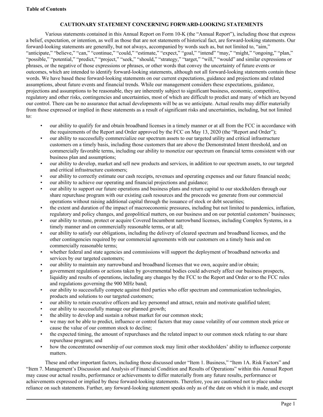 CAUTIONARY STATEMENT CONCERNING FORWARD-LOOKING STATEMENTS Various statements contained in this Annual Report on Form 10-K (the “Annual Report”), including those that express a belief, expectation, or intention, as well as those that are not statements of historical fact, are forward-looking statements. Our forward-looking statements are generally, but not always, accompanied by words such as, but not limited to, “aim,” “anticipate,” “believe,” “can,” “continue,” “could,” “estimate,” “expect,” “goal,” “intend” “may,” “might,” “ongoing,” “plan,” “possible,” “potential,” “predict,” “project,” “seek,” “should,” “strategy,” “target,” “will,” “would” and similar expressions or phrases, or the negative of those expressions or phrases, or other words that convey the uncertainty of future events or outcomes, which are intended to identify forward-looking statements, although not all forward-looking statements contain these words. We have based these forward-looking statements on our current expectations, guidance and projections and related assumptions, about future events and financial trends. While our management considers these expectations, guidance, projections and assumptions to be reasonable, they are inherently subject to significant business, economic, competitive, regulatory and other risks, contingencies and uncertainties, most of which are difficult to predict and many of which are beyond our control. There can be no assurance that actual developments will be as we anticipate. Actual results may differ materially from those expressed or implied in these statements as a result of significant risks and uncertainties, including, but not limited to: • our ability to qualify for and obtain broadband licenses in a timely manner or at all from the FCC in accordance with the requirements of the Report and Order approved by the FCC on May 13, 2020 (the “Report and Order”); • our ability to successfully commercialize our spectrum assets to our targeted utility and critical infrastructure customers on a timely basis, including those customers that are above the Demonstrated Intent threshold, and on commercially favorable terms, including our ability to monetize our spectrum on financial terms consistent with our business plan and assumptions; • our ability to develop, market and sell new products and services, in addition to our spectrum assets, to our targeted and critical infrastructure customers; • our ability to correctly estimate our cash receipts, revenues and operating expenses and our future financial needs; • our ability to achieve our operating and financial projections and guidance; • our ability to support our future operations and business plans and return capital to our stockholders through our share repurchase program with our existing cash resources and the proceeds we generate from our commercial operations without raising additional capital through the issuance of stock or debt securities; • the extent and duration of the impact of macroeconomic pressures, including but not limited to pandemics, inflation, regulatory and policy changes, and geopolitical matters, on our business and on our potential customers’ businesses; • our ability to retune, protect or acquire Covered Incumbent narrowband licenses, including Complex Systems, in a timely manner and on commercially reasonable terms, or at all; • our ability to satisfy our obligations, including the delivery of cleared spectrum and broadband licenses, and the other contingencies required by our commercial agreements with our customers on a timely basis and on commercially reasonable terms; • whether federal and state agencies and commissions will support the deployment of broadband networks and services by our targeted customers; • our ability to maintain any narrowband and broadband licenses that we own, acquire and/or obtain; • government regulations or actions taken by governmental bodies could adversely affect our business prospects, liquidity and results of operations, including any changes by the FCC to the Report and Order or to the FCC rules and regulations governing the 900 MHz band; • our ability to successfully compete against third parties who offer spectrum and communication technologies, products and solutions to our targeted customers; • our ability to retain executive officers and key personnel and attract, retain and motivate qualified talent; • our ability to successfully manage our planned growth; • the ability to develop and sustain a robust market for our common stock; • we may not be able to predict, influence or control factors that may cause volatility of our common stock price or cause the value of our common stock to decline; • the expected timing, the amount of repurchases and the related impact to our common stock relating to our share repurchase program; and • how the concentrated ownership of our common stock may limit other stockholders’ ability to influence corporate matters. These and other important factors, including those discussed under “Item 1. Business,” “Item 1A. Risk Factors” and “Item 7. Management’s Discussion and Analysis of Financial Condition and Results of Operations” within this Annual Report may cause our actual results, performance or achievements to differ materially from any future results, performance or achievements expressed or implied by these forward-looking statements. Therefore, you are cautioned not to place undue reliance on such statements. Further, any forward-looking statement speaks only as of the date on which it is made, and except Table of Contents Page 1