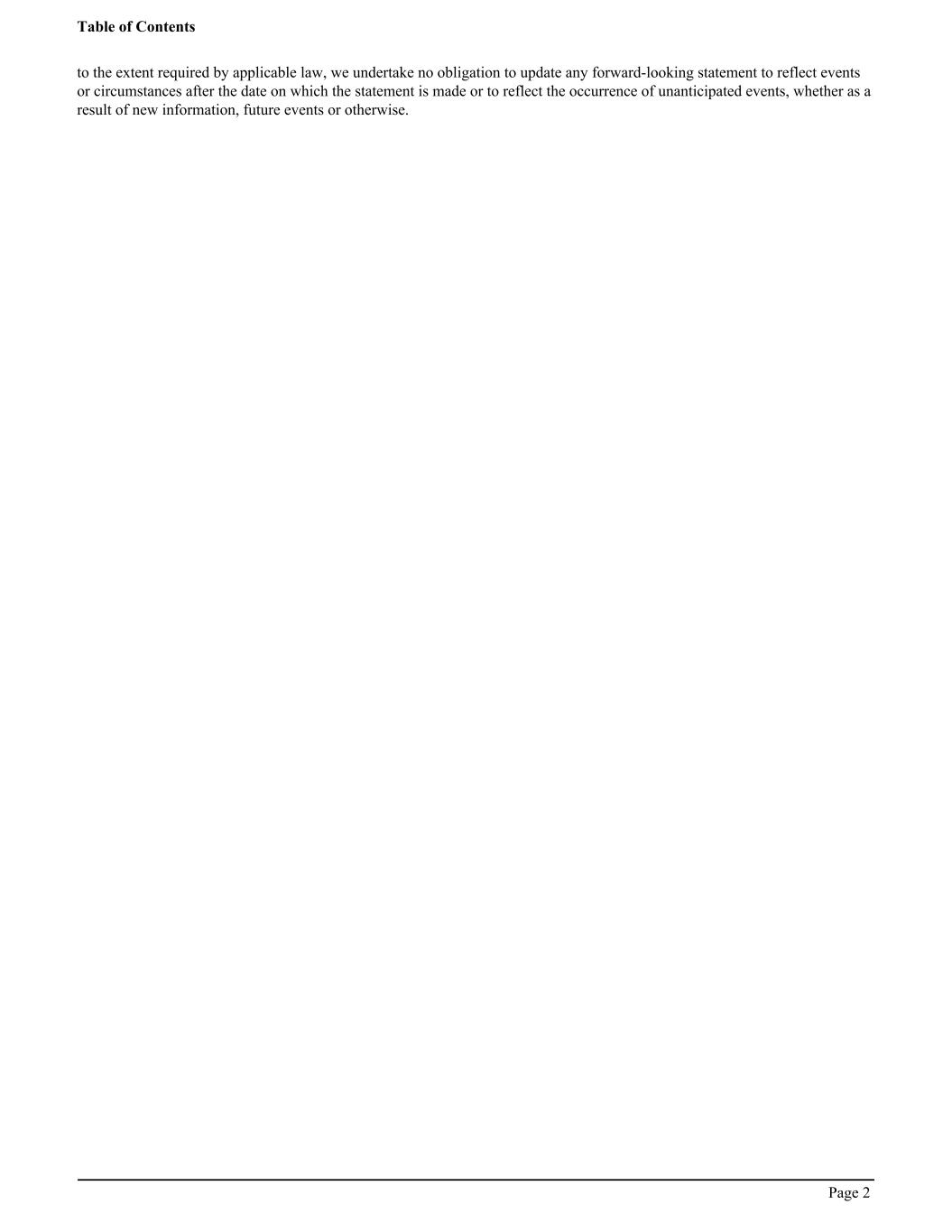 to the extent required by applicable law, we undertake no obligation to update any forward-looking statement to reflect events or circumstances after the date on which the statement is made or to reflect the occurrence of unanticipated events, whether as a result of new information, future events or otherwise. Table of Contents Page 2
