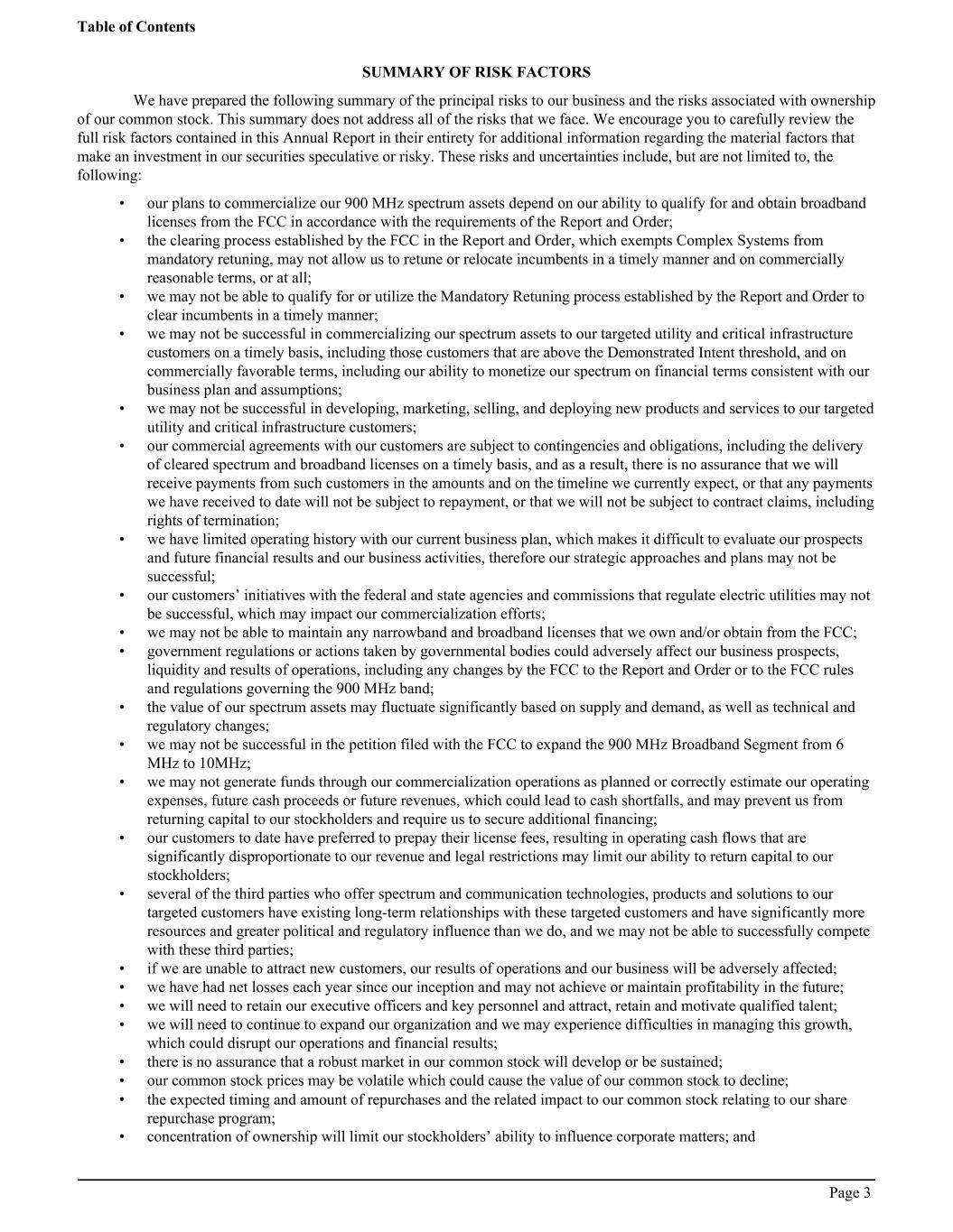 SUMMARY OF RISK FACTORS We have prepared the following summary of the principal risks to our business and the risks associated with ownership of our common stock. This summary does not address all of the risks that we face. We encourage you to carefully review the full risk factors contained in this Annual Report in their entirety for additional information regarding the material factors that make an investment in our securities speculative or risky. These risks and uncertainties include, but are not limited to, the following: • our plans to commercialize our 900 MHz spectrum assets depend on our ability to qualify for and obtain broadband licenses from the FCC in accordance with the requirements of the Report and Order; • the clearing process established by the FCC in the Report and Order, which exempts Complex Systems from mandatory retuning, may not allow us to retune or relocate incumbents in a timely manner and on commercially reasonable terms, or at all; • we may not be able to qualify for or utilize the Mandatory Retuning process established by the Report and Order to clear incumbents in a timely manner; • we may not be successful in commercializing our spectrum assets to our targeted utility and critical infrastructure customers on a timely basis, including those customers that are above the Demonstrated Intent threshold, and on commercially favorable terms, including our ability to monetize our spectrum on financial terms consistent with our business plan and assumptions; • we may not be successful in developing, marketing, selling, and deploying new products and services to our targeted utility and critical infrastructure customers; • our commercial agreements with our customers are subject to contingencies and obligations, including the delivery of cleared spectrum and broadband licenses on a timely basis, and as a result, there is no assurance that we will receive payments from such customers in the amounts and on the timeline we currently expect, or that any payments we have received to date will not be subject to repayment, or that we will not be subject to contract claims, including rights of termination; • we have limited operating history with our current business plan, which makes it difficult to evaluate our prospects and future financial results and our business activities, therefore our strategic approaches and plans may not be successful; • our customers’ initiatives with the federal and state agencies and commissions that regulate electric utilities may not be successful, which may impact our commercialization efforts; • we may not be able to maintain any narrowband and broadband licenses that we own and/or obtain from the FCC; • government regulations or actions taken by governmental bodies could adversely affect our business prospects, liquidity and results of operations, including any changes by the FCC to the Report and Order or to the FCC rules and regulations governing the 900 MHz band; • the value of our spectrum assets may fluctuate significantly based on supply and demand, as well as technical and regulatory changes; • we may not be successful in the petition filed with the FCC to expand the 900 MHz Broadband Segment from 6 MHz to 10MHz; • we may not generate funds through our commercialization operations as planned or correctly estimate our operating expenses, future cash proceeds or future revenues, which could lead to cash shortfalls, and may prevent us from returning capital to our stockholders and require us to secure additional financing; • our customers to date have preferred to prepay their license fees, resulting in operating cash flows that are significantly disproportionate to our revenue and legal restrictions may limit our ability to return capital to our stockholders; • several of the third parties who offer spectrum and communication technologies, products and solutions to our targeted customers have existing long-term relationships with these targeted customers and have significantly more resources and greater political and regulatory influence than we do, and we may not be able to successfully compete with these third parties; • if we are unable to attract new customers, our results of operations and our business will be adversely affected; • we have had net losses each year since our inception and may not achieve or maintain profitability in the future; • we will need to retain our executive officers and key personnel and attract, retain and motivate qualified talent; • we will need to continue to expand our organization and we may experience difficulties in managing this growth, which could disrupt our operations and financial results; • there is no assurance that a robust market in our common stock will develop or be sustained; • our common stock prices may be volatile which could cause the value of our common stock to decline; • the expected timing and amount of repurchases and the related impact to our common stock relating to our share repurchase program; • concentration of ownership will limit our stockholders’ ability to influence corporate matters; and Table of Contents Page 3