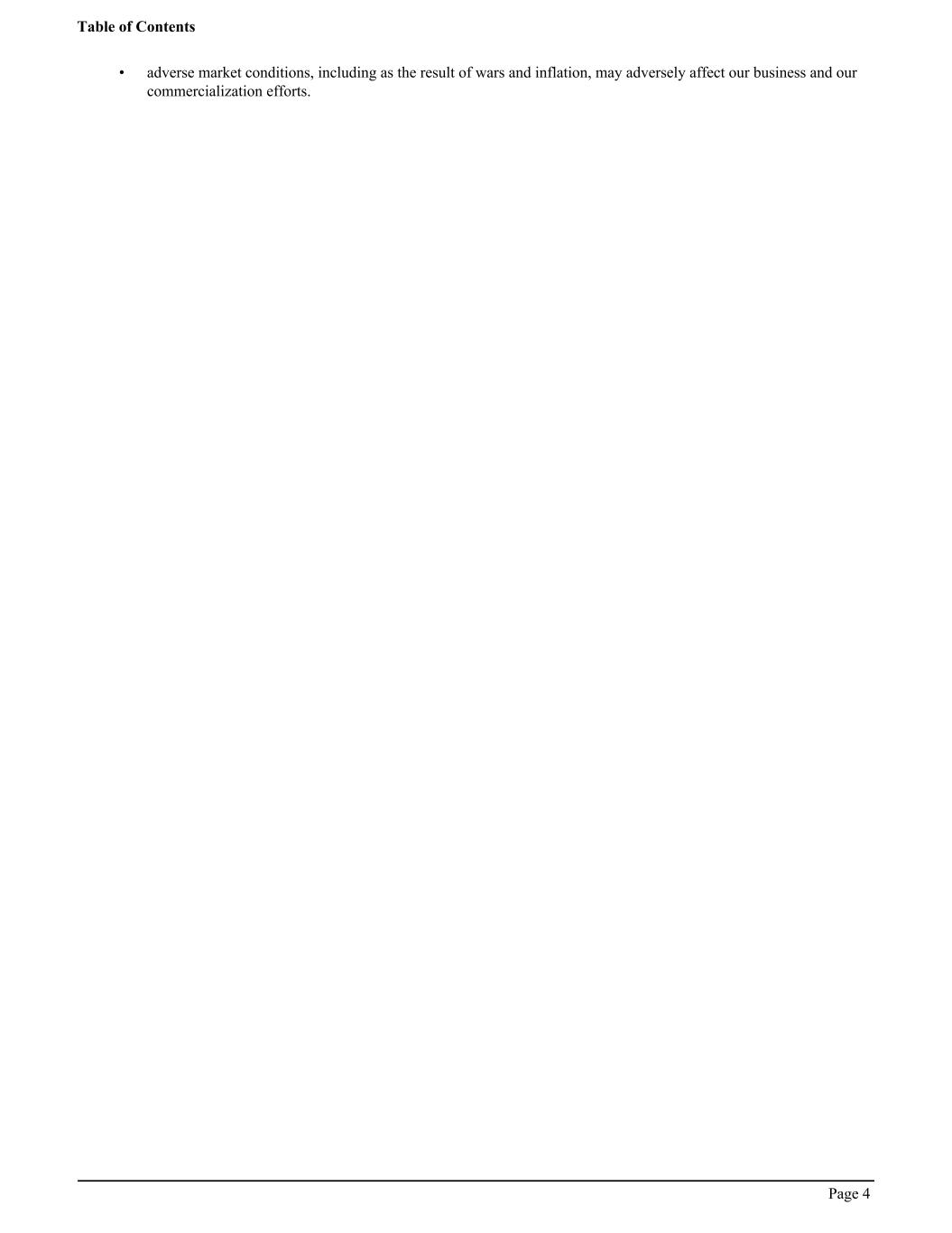 • adverse market conditions, including as the result of wars and inflation, may adversely affect our business and our commercialization efforts. Table of Contents Page 4