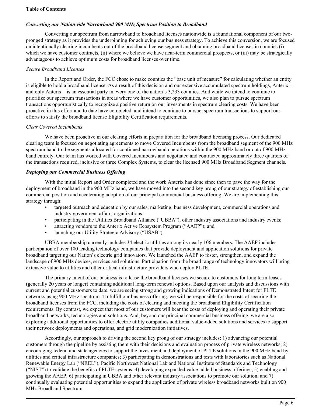 Converting our Nationwide Narrowband 900 MHz Spectrum Position to Broadband Converting our spectrum from narrowband to broadband licenses nationwide is a foundational component of our two- pronged strategy as it provides the underpinning for achieving our business strategy. To achieve this conversion, we are focused on intentionally clearing incumbents out of the broadband license segment and obtaining broadband licenses in counties (i) which we have customer contracts, (ii) where we believe we have near-term commercial prospects, or (iii) may be strategically advantageous to achieve optimum costs for broadband licenses over time. Secure Broadband Licenses In the Report and Order, the FCC chose to make counties the “base unit of measure” for calculating whether an entity is eligible to hold a broadband license. As a result of this decision and our extensive accumulated spectrum holdings, Anterix— and only Anterix—is an essential party in every one of the nation’s 3,233 counties. And while we intend to continue to prioritize our spectrum transactions in areas where we have customer opportunities, we also plan to pursue spectrum transactions opportunistically to recognize a positive return on our investments in spectrum clearing costs. We have been proactive in this effort and to date have completed, and intend to continue to pursue, spectrum transactions to support our efforts to satisfy the broadband license Eligibility Certification requirements. Clear Covered Incumbents We have been proactive in our clearing efforts in preparation for the broadband licensing process. Our dedicated clearing team is focused on negotiating agreements to move Covered Incumbents from the broadband segment of the 900 MHz spectrum band to the segments allocated for continued narrowband operations within the 900 MHz band or out of 900 MHz band entirely. Our team has worked with Covered Incumbents and negotiated and contracted approximately three quarters of the transactions required, inclusive of three Complex Systems, to clear the licensed 900 MHz Broadband Segment channels. Deploying our Commercial Business Offering With the initial Report and Order completed and the work Anterix has done since then to pave the way for the deployment of broadband in the 900 MHz band, we have moved into the second key prong of our strategy of establishing our commercial position and accelerating adoption of our principal commercial business offering. We are implementing this strategy through: • targeted outreach and education by our sales, marketing, business development, commercial operations and industry government affairs organizations; • participating in the Utilities Broadband Alliance (“UBBA”), other industry associations and industry events; • attracting vendors to the Anterix Active Ecosystem Program (“AAEP”); and • launching our Utility Strategic Advisory (“USAB”). UBBA membership currently includes 34 electric utilities among its nearly 106 members. The AAEP includes participation of over 100 leading technology companies that provide deployment and application solutions for private broadband targeting our Nation’s electric grid innovators. We launched the AAEP to foster, strengthen, and expand the landscape of 900 MHz devices, services and solutions. Participation from the broad range of technology innovators will bring extensive value to utilities and other critical infrastructure providers who deploy PLTE. The primary intent of our business is to lease the broadband licenses we secure to customers for long term-leases (generally 20 years or longer) containing additional long-term renewal options. Based upon our analysis and discussions with current and potential customers to date, we are seeing strong and growing indications of Demonstrated Intent for PLTE networks using 900 MHz spectrum. To fulfill our business offering, we will be responsible for the costs of securing the broadband licenses from the FCC, including the costs of clearing and meeting the broadband Eligibility Certification requirements. By contrast, we expect that most of our customers will bear the costs of deploying and operating their private broadband networks, technologies and solutions. And, beyond our principal commercial business offering, we are also exploring additional opportunities to offer electric utility companies additional value-added solutions and services to support their network deployments and operations, and grid modernization initiatives. Accordingly, our approach to driving the second key prong of our strategy includes: 1) advancing our potential customers through the pipeline by assisting them with their decisions and evaluation process of private wireless networks; 2) encouraging federal and state agencies to support the investment and deployment of PLTE solutions in the 900 MHz band by utilities and critical infrastructure companies; 3) participating in demonstrations and tests with laboratories such as National Renewable Energy Lab (“NREL”), Pacific Northwest National Lab and National Institute of Standards and Technology (“NIST”) to validate the benefits of PLTE systems; 4) developing expanded value-added business offerings; 5) enabling and growing the AAEP; 6) participating in UBBA and other relevant industry associations to promote our solution; and 7) continually evaluating potential opportunities to expand the application of private wireless broadband networks built on 900 MHz Broadband Spectrum. Table of Contents Page 6