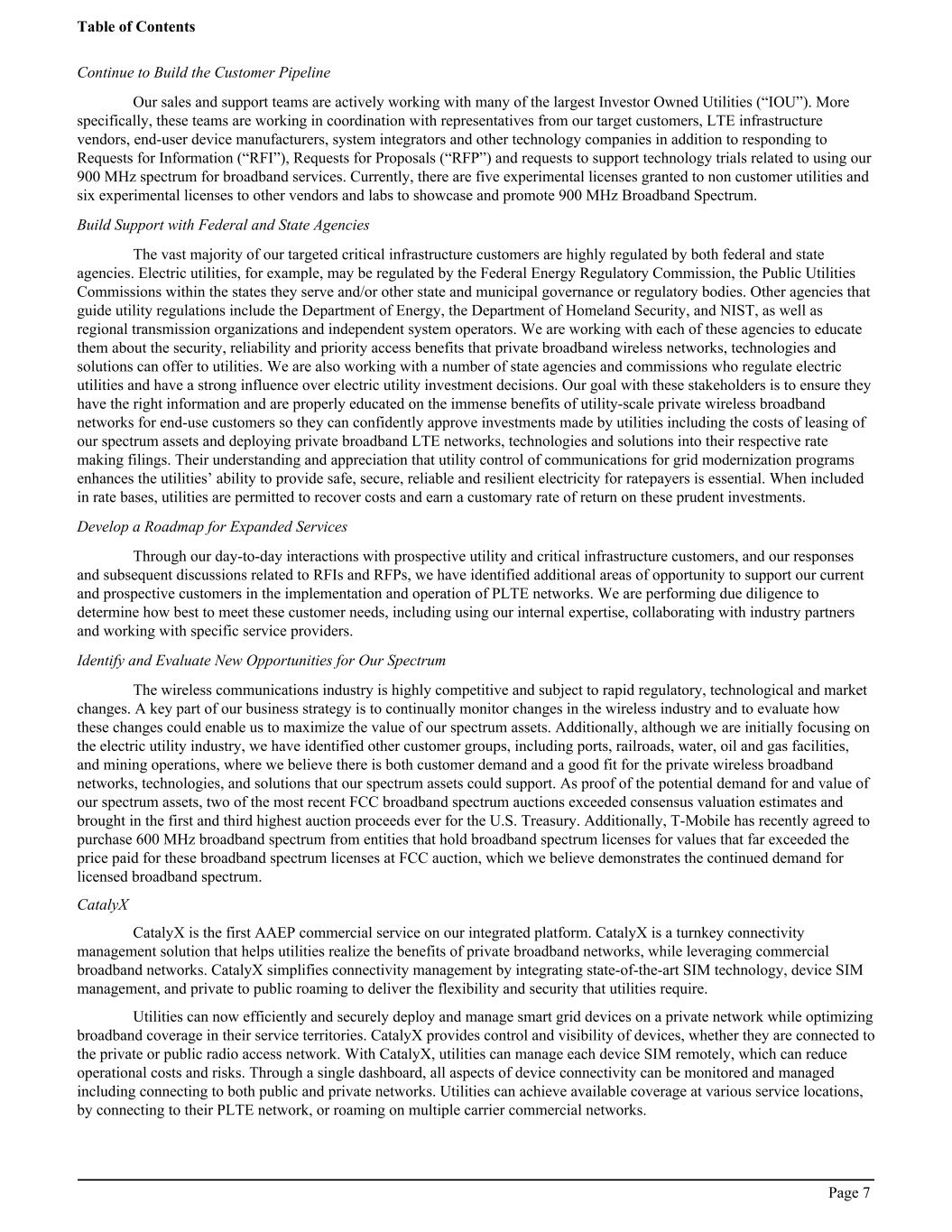 Continue to Build the Customer Pipeline Our sales and support teams are actively working with many of the largest Investor Owned Utilities (“IOU”). More specifically, these teams are working in coordination with representatives from our target customers, LTE infrastructure vendors, end-user device manufacturers, system integrators and other technology companies in addition to responding to Requests for Information (“RFI”), Requests for Proposals (“RFP”) and requests to support technology trials related to using our 900 MHz spectrum for broadband services. Currently, there are five experimental licenses granted to non customer utilities and six experimental licenses to other vendors and labs to showcase and promote 900 MHz Broadband Spectrum. Build Support with Federal and State Agencies The vast majority of our targeted critical infrastructure customers are highly regulated by both federal and state agencies. Electric utilities, for example, may be regulated by the Federal Energy Regulatory Commission, the Public Utilities Commissions within the states they serve and/or other state and municipal governance or regulatory bodies. Other agencies that guide utility regulations include the Department of Energy, the Department of Homeland Security, and NIST, as well as regional transmission organizations and independent system operators. We are working with each of these agencies to educate them about the security, reliability and priority access benefits that private broadband wireless networks, technologies and solutions can offer to utilities. We are also working with a number of state agencies and commissions who regulate electric utilities and have a strong influence over electric utility investment decisions. Our goal with these stakeholders is to ensure they have the right information and are properly educated on the immense benefits of utility-scale private wireless broadband networks for end-use customers so they can confidently approve investments made by utilities including the costs of leasing of our spectrum assets and deploying private broadband LTE networks, technologies and solutions into their respective rate making filings. Their understanding and appreciation that utility control of communications for grid modernization programs enhances the utilities’ ability to provide safe, secure, reliable and resilient electricity for ratepayers is essential. When included in rate bases, utilities are permitted to recover costs and earn a customary rate of return on these prudent investments. Develop a Roadmap for Expanded Services Through our day-to-day interactions with prospective utility and critical infrastructure customers, and our responses and subsequent discussions related to RFIs and RFPs, we have identified additional areas of opportunity to support our current and prospective customers in the implementation and operation of PLTE networks. We are performing due diligence to determine how best to meet these customer needs, including using our internal expertise, collaborating with industry partners and working with specific service providers. Identify and Evaluate New Opportunities for Our Spectrum The wireless communications industry is highly competitive and subject to rapid regulatory, technological and market changes. A key part of our business strategy is to continually monitor changes in the wireless industry and to evaluate how these changes could enable us to maximize the value of our spectrum assets. Additionally, although we are initially focusing on the electric utility industry, we have identified other customer groups, including ports, railroads, water, oil and gas facilities, and mining operations, where we believe there is both customer demand and a good fit for the private wireless broadband networks, technologies, and solutions that our spectrum assets could support. As proof of the potential demand for and value of our spectrum assets, two of the most recent FCC broadband spectrum auctions exceeded consensus valuation estimates and brought in the first and third highest auction proceeds ever for the U.S. Treasury. Additionally, T-Mobile has recently agreed to purchase 600 MHz broadband spectrum from entities that hold broadband spectrum licenses for values that far exceeded the price paid for these broadband spectrum licenses at FCC auction, which we believe demonstrates the continued demand for licensed broadband spectrum. CatalyX CatalyX is the first AAEP commercial service on our integrated platform. CatalyX is a turnkey connectivity management solution that helps utilities realize the benefits of private broadband networks, while leveraging commercial broadband networks. CatalyX simplifies connectivity management by integrating state-of-the-art SIM technology, device SIM management, and private to public roaming to deliver the flexibility and security that utilities require. Utilities can now efficiently and securely deploy and manage smart grid devices on a private network while optimizing broadband coverage in their service territories. CatalyX provides control and visibility of devices, whether they are connected to the private or public radio access network. With CatalyX, utilities can manage each device SIM remotely, which can reduce operational costs and risks. Through a single dashboard, all aspects of device connectivity can be monitored and managed including connecting to both public and private networks. Utilities can achieve available coverage at various service locations, by connecting to their PLTE network, or roaming on multiple carrier commercial networks. Table of Contents Page 7