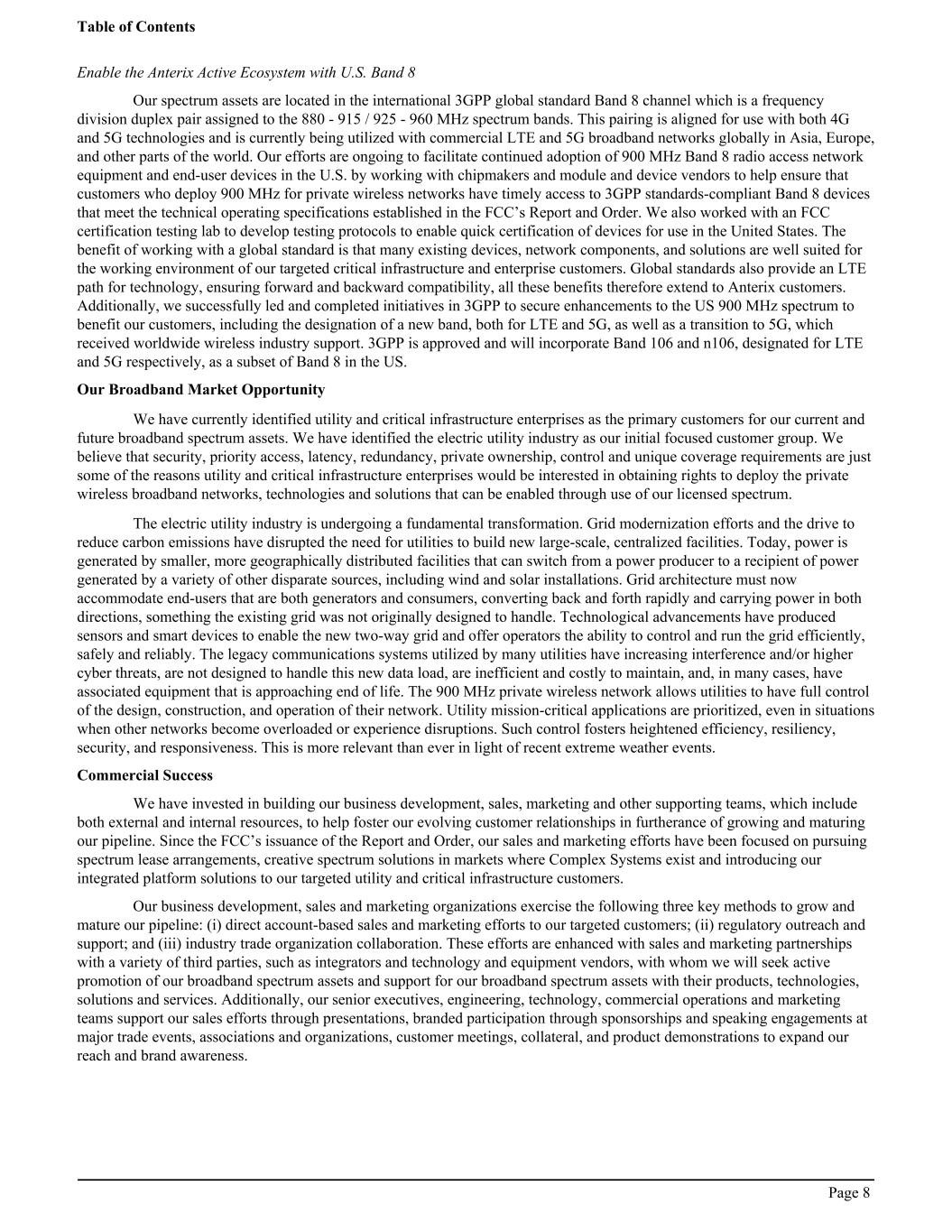 Enable the Anterix Active Ecosystem with U.S. Band 8 Our spectrum assets are located in the international 3GPP global standard Band 8 channel which is a frequency division duplex pair assigned to the 880 - 915 / 925 - 960 MHz spectrum bands. This pairing is aligned for use with both 4G and 5G technologies and is currently being utilized with commercial LTE and 5G broadband networks globally in Asia, Europe, and other parts of the world. Our efforts are ongoing to facilitate continued adoption of 900 MHz Band 8 radio access network equipment and end-user devices in the U.S. by working with chipmakers and module and device vendors to help ensure that customers who deploy 900 MHz for private wireless networks have timely access to 3GPP standards-compliant Band 8 devices that meet the technical operating specifications established in the FCC’s Report and Order. We also worked with an FCC certification testing lab to develop testing protocols to enable quick certification of devices for use in the United States. The benefit of working with a global standard is that many existing devices, network components, and solutions are well suited for the working environment of our targeted critical infrastructure and enterprise customers. Global standards also provide an LTE path for technology, ensuring forward and backward compatibility, all these benefits therefore extend to Anterix customers. Additionally, we successfully led and completed initiatives in 3GPP to secure enhancements to the US 900 MHz spectrum to benefit our customers, including the designation of a new band, both for LTE and 5G, as well as a transition to 5G, which received worldwide wireless industry support. 3GPP is approved and will incorporate Band 106 and n106, designated for LTE and 5G respectively, as a subset of Band 8 in the US. Our Broadband Market Opportunity We have currently identified utility and critical infrastructure enterprises as the primary customers for our current and future broadband spectrum assets. We have identified the electric utility industry as our initial focused customer group. We believe that security, priority access, latency, redundancy, private ownership, control and unique coverage requirements are just some of the reasons utility and critical infrastructure enterprises would be interested in obtaining rights to deploy the private wireless broadband networks, technologies and solutions that can be enabled through use of our licensed spectrum. The electric utility industry is undergoing a fundamental transformation. Grid modernization efforts and the drive to reduce carbon emissions have disrupted the need for utilities to build new large-scale, centralized facilities. Today, power is generated by smaller, more geographically distributed facilities that can switch from a power producer to a recipient of power generated by a variety of other disparate sources, including wind and solar installations. Grid architecture must now accommodate end-users that are both generators and consumers, converting back and forth rapidly and carrying power in both directions, something the existing grid was not originally designed to handle. Technological advancements have produced sensors and smart devices to enable the new two-way grid and offer operators the ability to control and run the grid efficiently, safely and reliably. The legacy communications systems utilized by many utilities have increasing interference and/or higher cyber threats, are not designed to handle this new data load, are inefficient and costly to maintain, and, in many cases, have associated equipment that is approaching end of life. The 900 MHz private wireless network allows utilities to have full control of the design, construction, and operation of their network. Utility mission-critical applications are prioritized, even in situations when other networks become overloaded or experience disruptions. Such control fosters heightened efficiency, resiliency, security, and responsiveness. This is more relevant than ever in light of recent extreme weather events. Commercial Success We have invested in building our business development, sales, marketing and other supporting teams, which include both external and internal resources, to help foster our evolving customer relationships in furtherance of growing and maturing our pipeline. Since the FCC’s issuance of the Report and Order, our sales and marketing efforts have been focused on pursuing spectrum lease arrangements, creative spectrum solutions in markets where Complex Systems exist and introducing our integrated platform solutions to our targeted utility and critical infrastructure customers. Our business development, sales and marketing organizations exercise the following three key methods to grow and mature our pipeline: (i) direct account-based sales and marketing efforts to our targeted customers; (ii) regulatory outreach and support; and (iii) industry trade organization collaboration. These efforts are enhanced with sales and marketing partnerships with a variety of third parties, such as integrators and technology and equipment vendors, with whom we will seek active promotion of our broadband spectrum assets and support for our broadband spectrum assets with their products, technologies, solutions and services. Additionally, our senior executives, engineering, technology, commercial operations and marketing teams support our sales efforts through presentations, branded participation through sponsorships and speaking engagements at major trade events, associations and organizations, customer meetings, collateral, and product demonstrations to expand our reach and brand awareness. Table of Contents Page 8